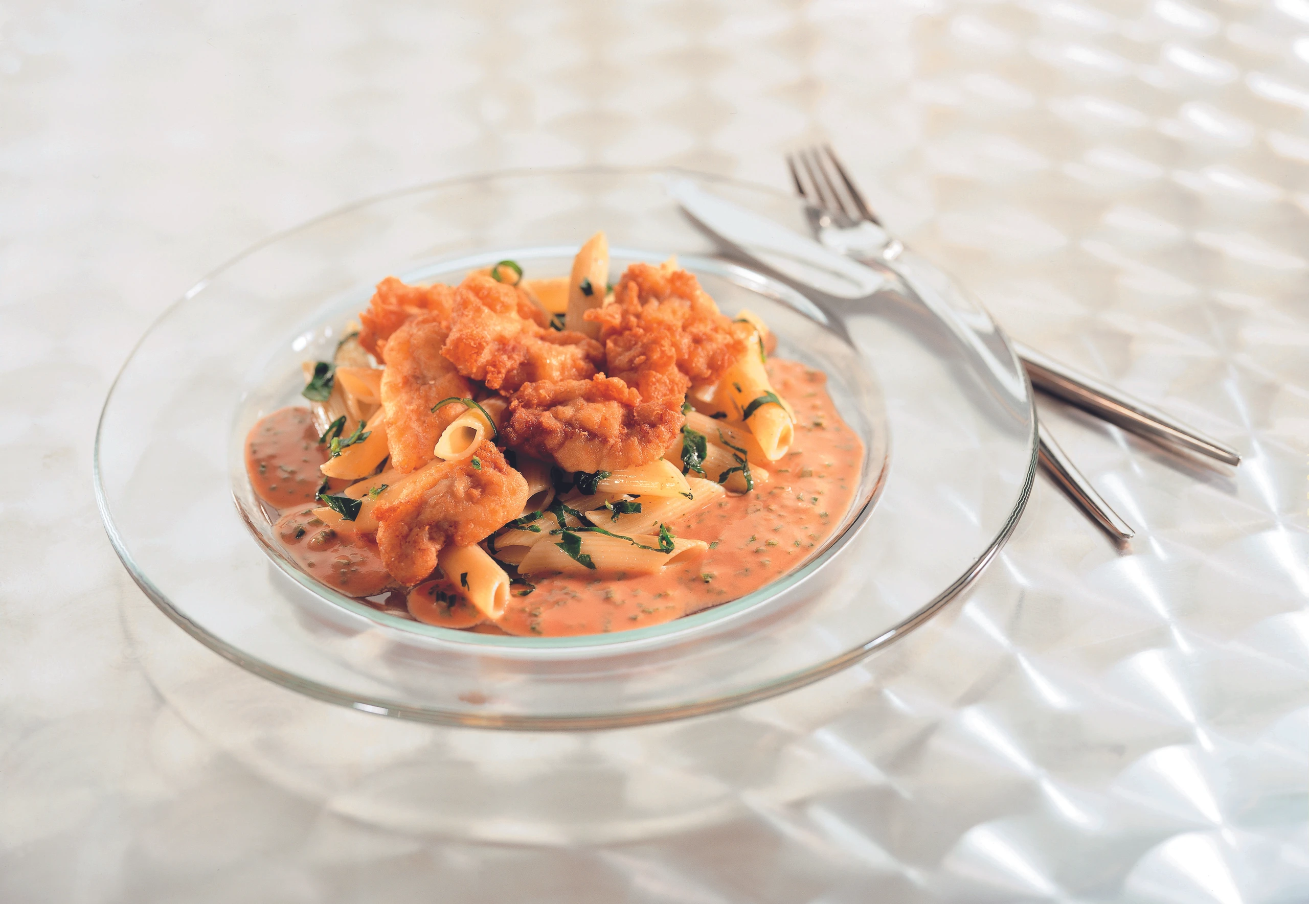 Kalbstreifen in Parmesanpanier mit Paradeissauce