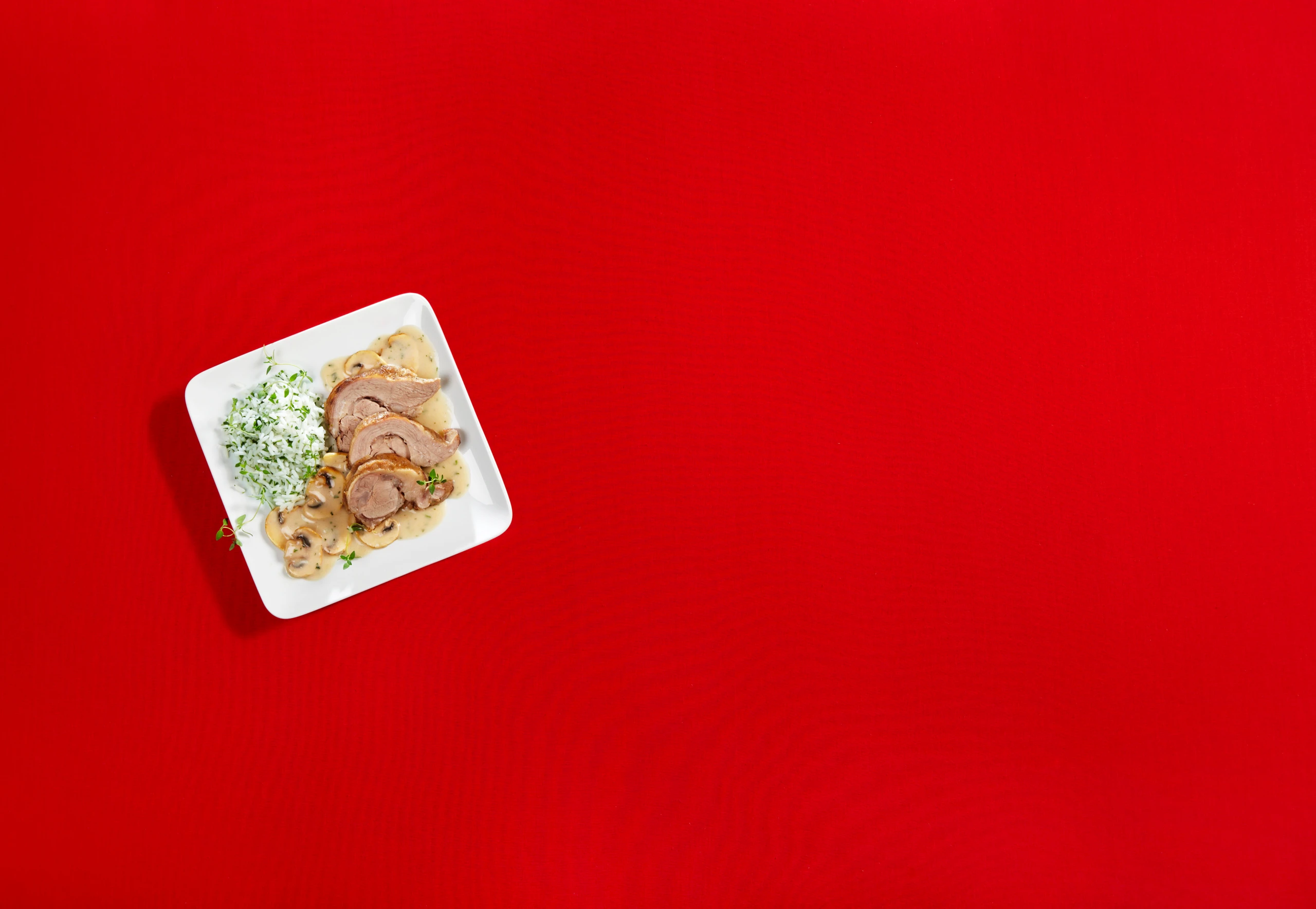 Fleisch herausnehmen und warm stellen. Rahm mit 2 gestr. EL Mehl verquirlen, in den Fond rühren und 5 Minuten köcheln. Sauce abseihen, Champignons und Petersilie untermischen. Fleisch schneiden, mit Sauce und Reis anrichten.