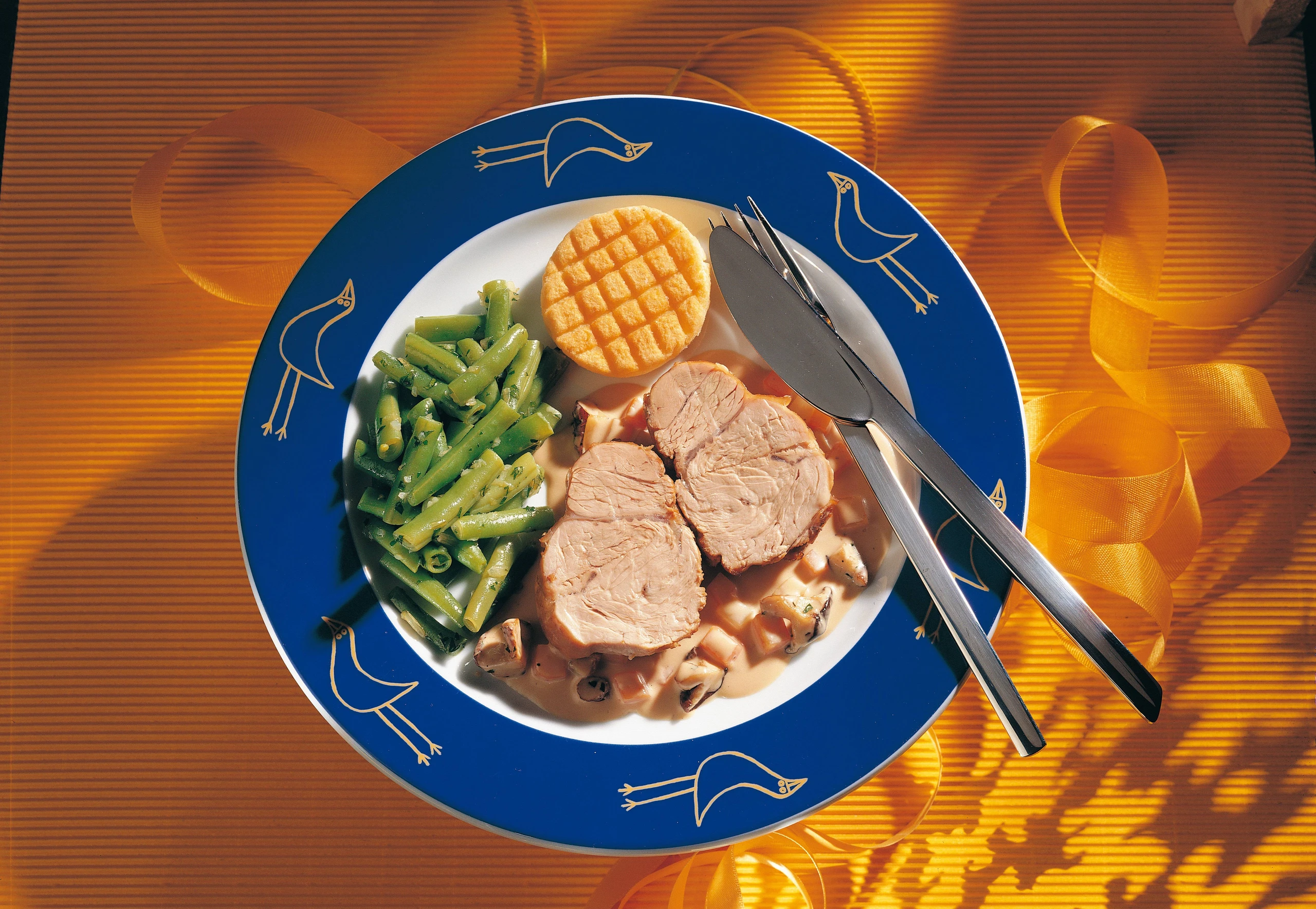 Kalbsvögerl aus der Sauce heben und warmstellen. Sauce mit Crème fraîche verrühren, Schwammerl und Petersilie untermischen und ca. 5 Minuten kochen. Fleisch in nicht zu dicke Scheiben schneiden und mit der Sauce anrichten. Als Beilage serviert man Fisolengemüse.