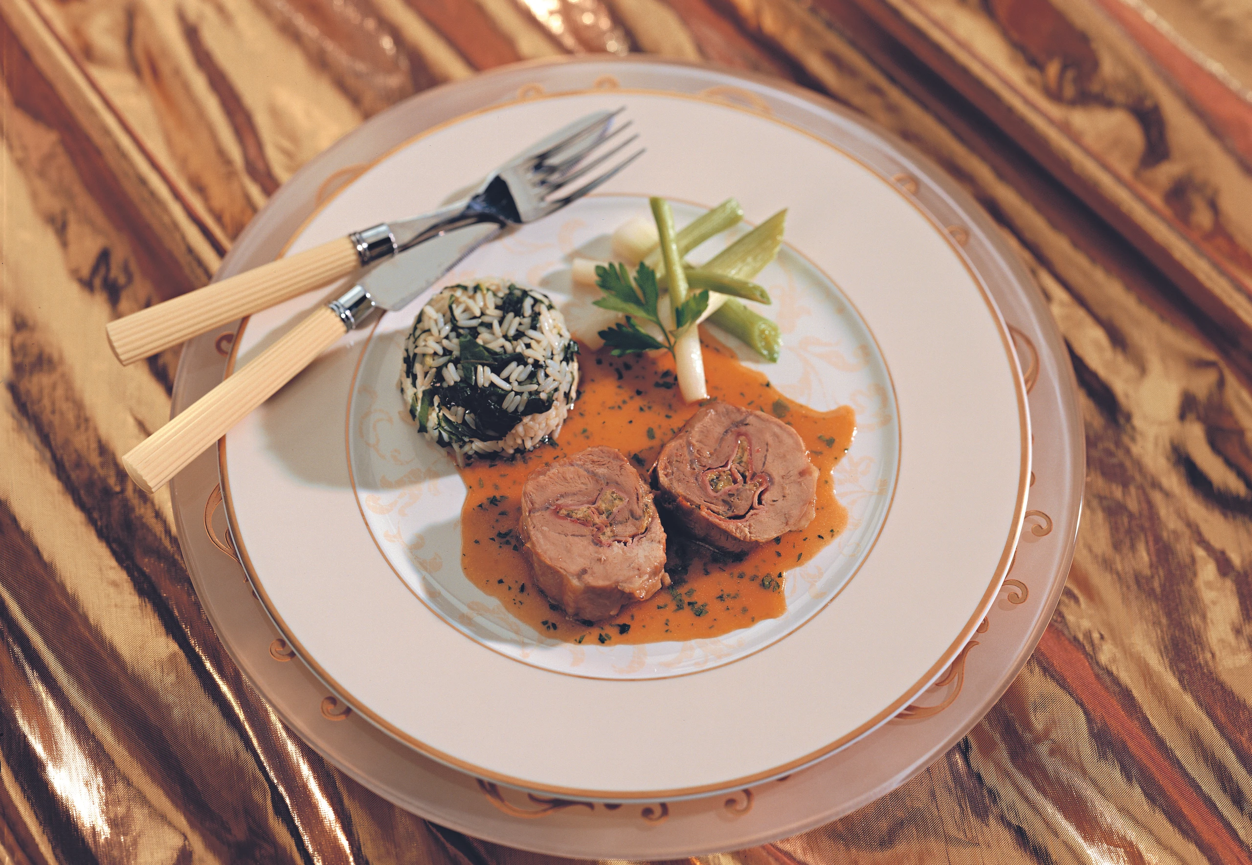 Kalbsvögerl-Rouladen mit Reis und Gemüse