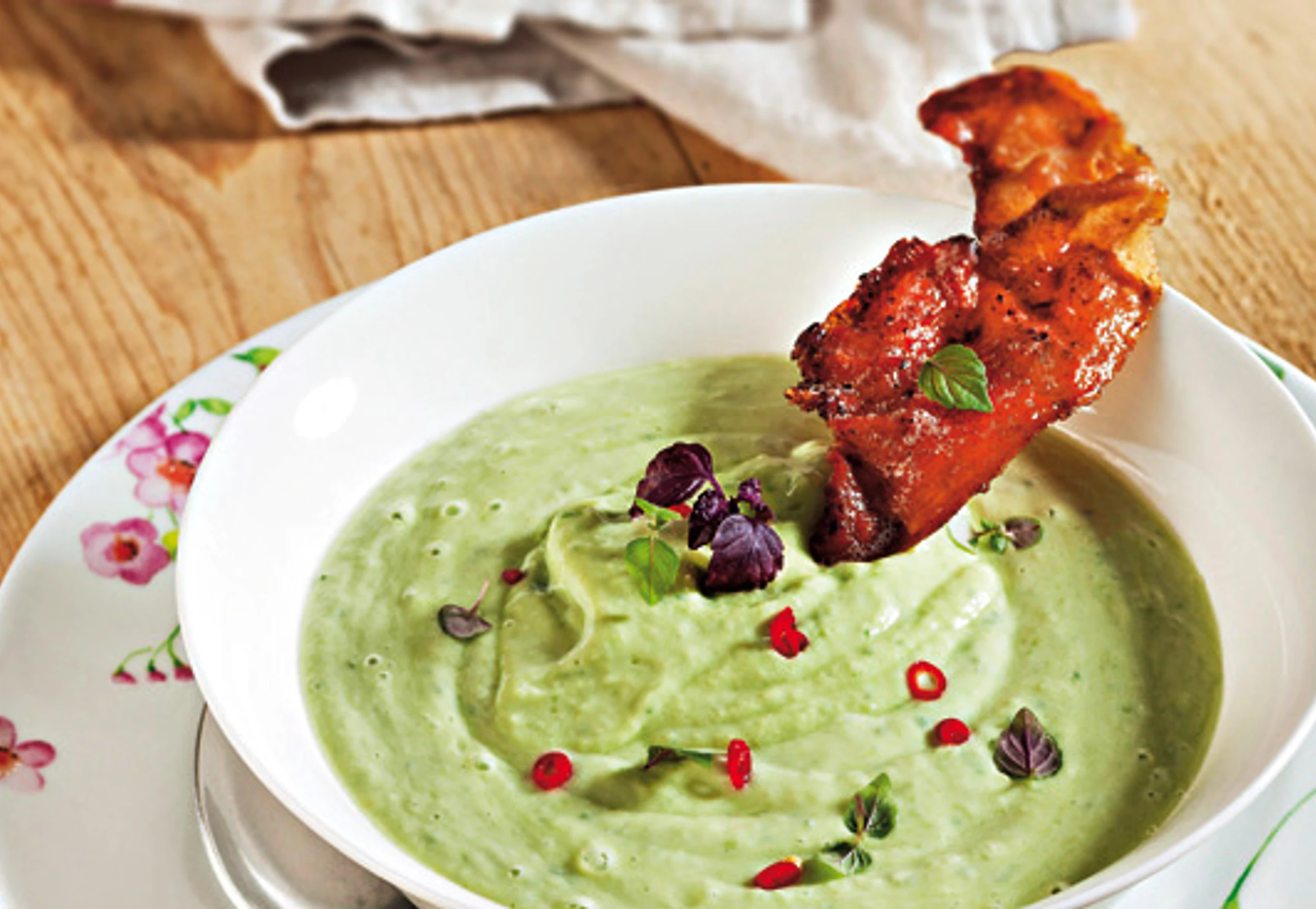 - Kresseblättchen von den Stielen schneiden. Chili in dünne Ringe schneiden. Suppe anrichten, mit Prosciutto, Kresse und Chili garniert servieren.