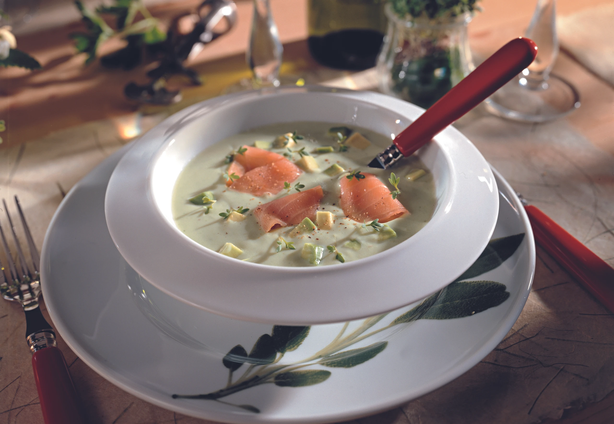Kalte Avocadosuppe mit Räucherlachs