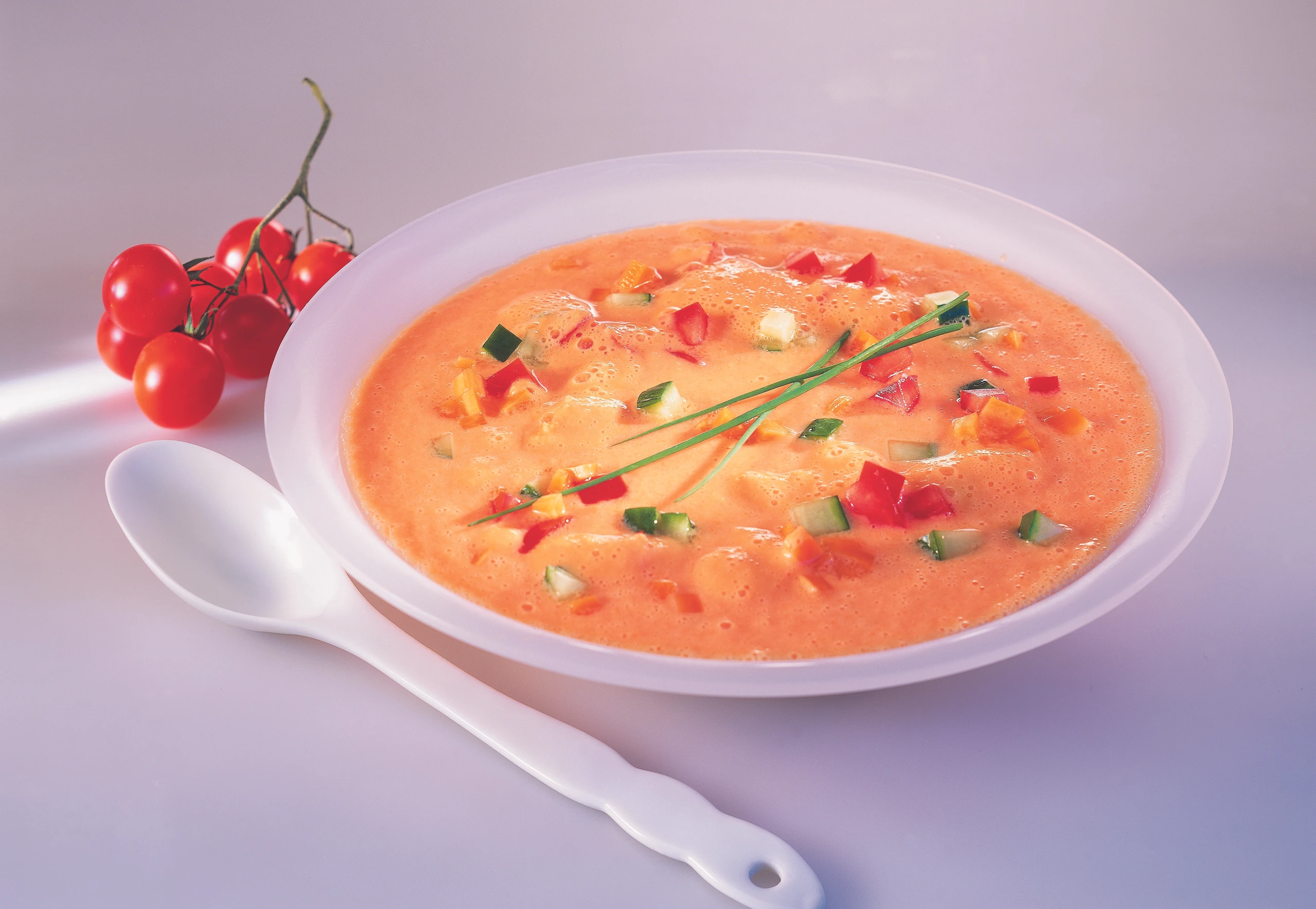 Die Suppe im Kühlschrank 30 Minuten durchziehen lassen, durch ein Sieb streichen und mit Schnittlauch vermischen. Suppe mit den Gemüsewürfeln garniert servieren.