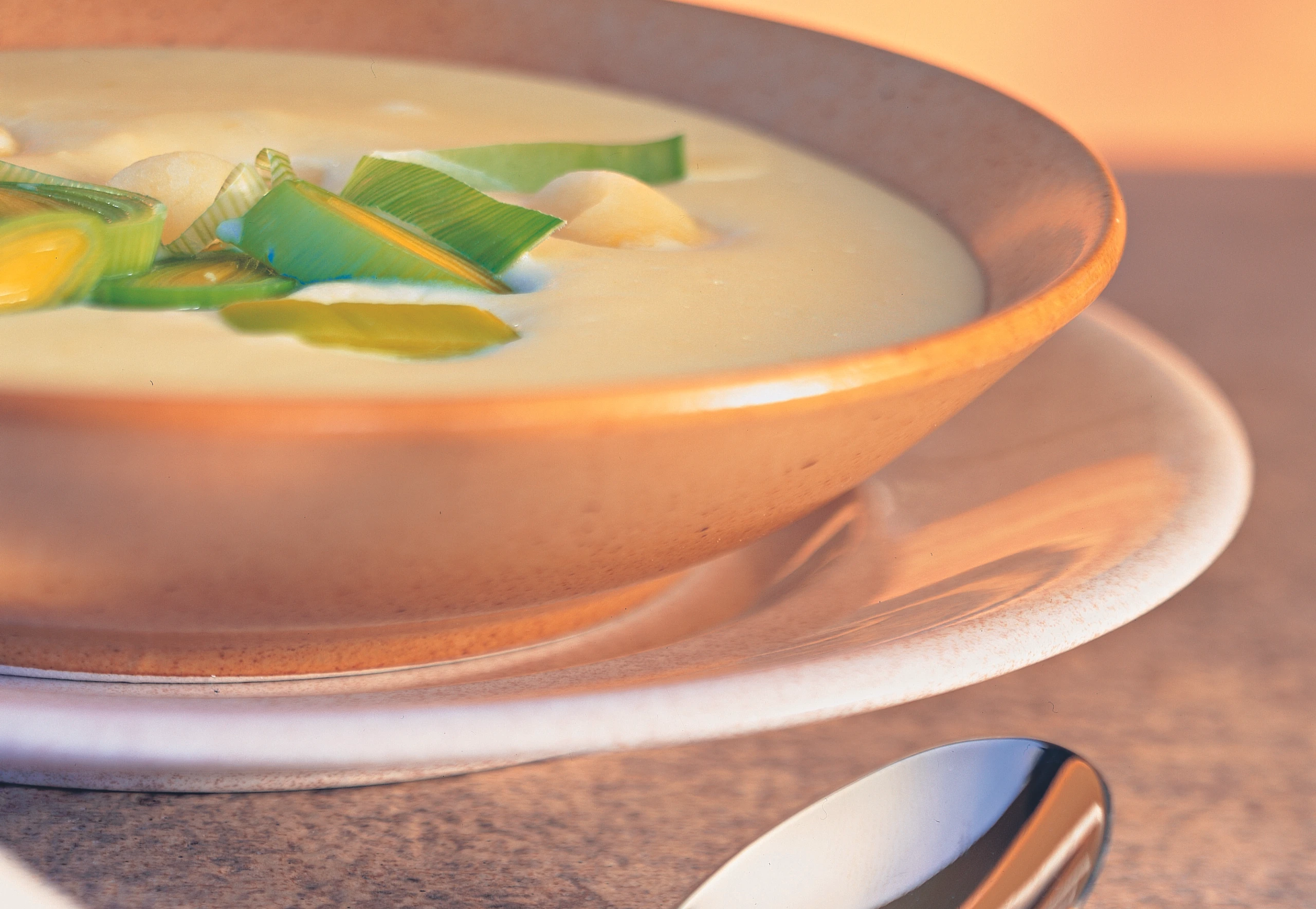 Suppe eventuell mit Salz, Pfeffer und Muskatnuss nachwürzen, in Teller schöpfen und mit den Lauchstücken bestreut servieren.