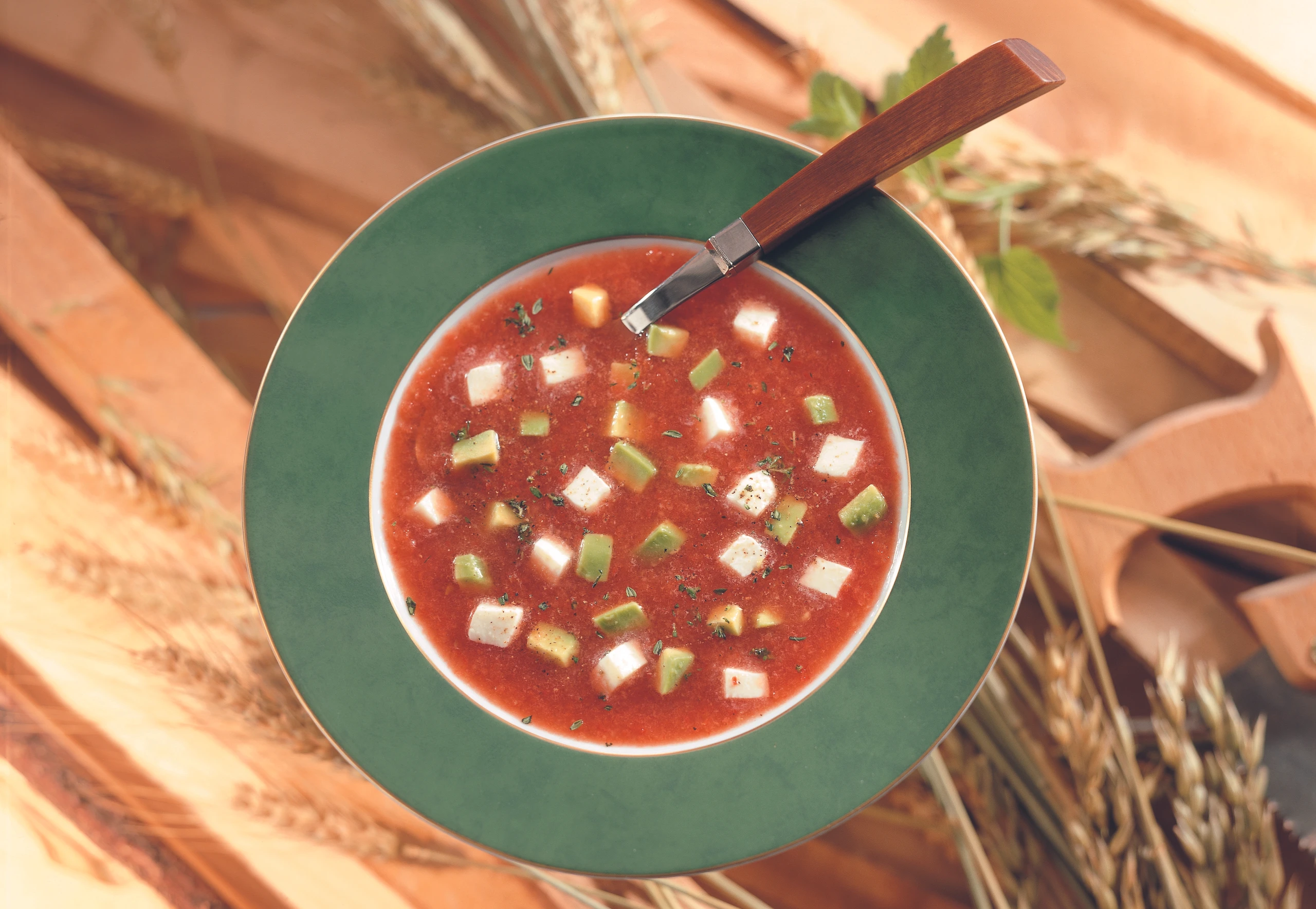 Kalte Gemüsesuppe mit Mozzarella und Avocados