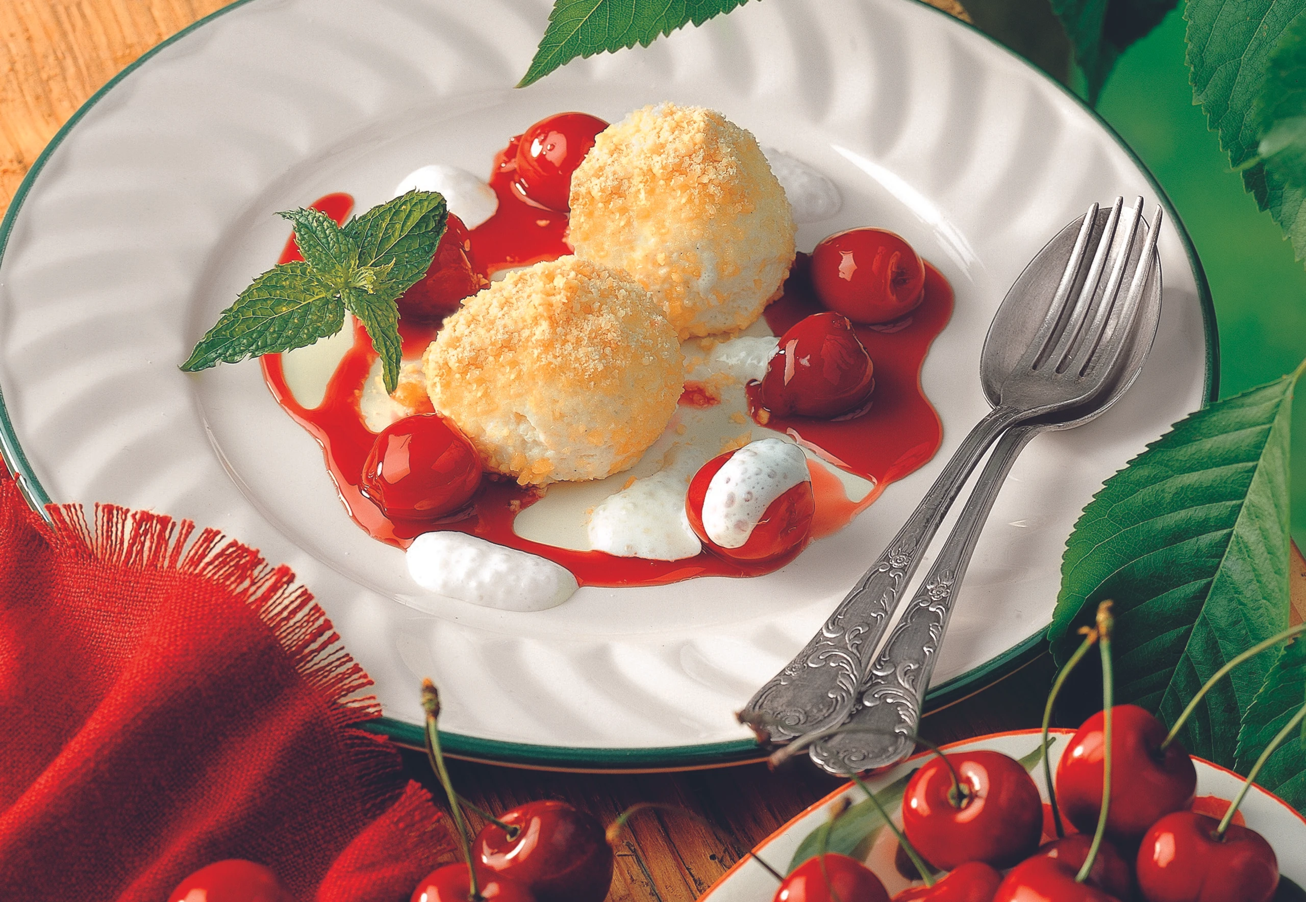 Zum Anrichten ca. 70 g der Pinienkerne fein hacken, den Rest fein reiben. Aus der Grießmasse mit einem Eisportionierer 8 Kugeln ausstechen, behutsam in den gehackten Pinienkernen wälzen und auf Teller legen. Grießknöderln mit geriebenen Pinienkernen bestreuen, mit Rotweinkirschen und Rahmschaum (siehe Rezepte) sowie Minzeblättern garnieren.