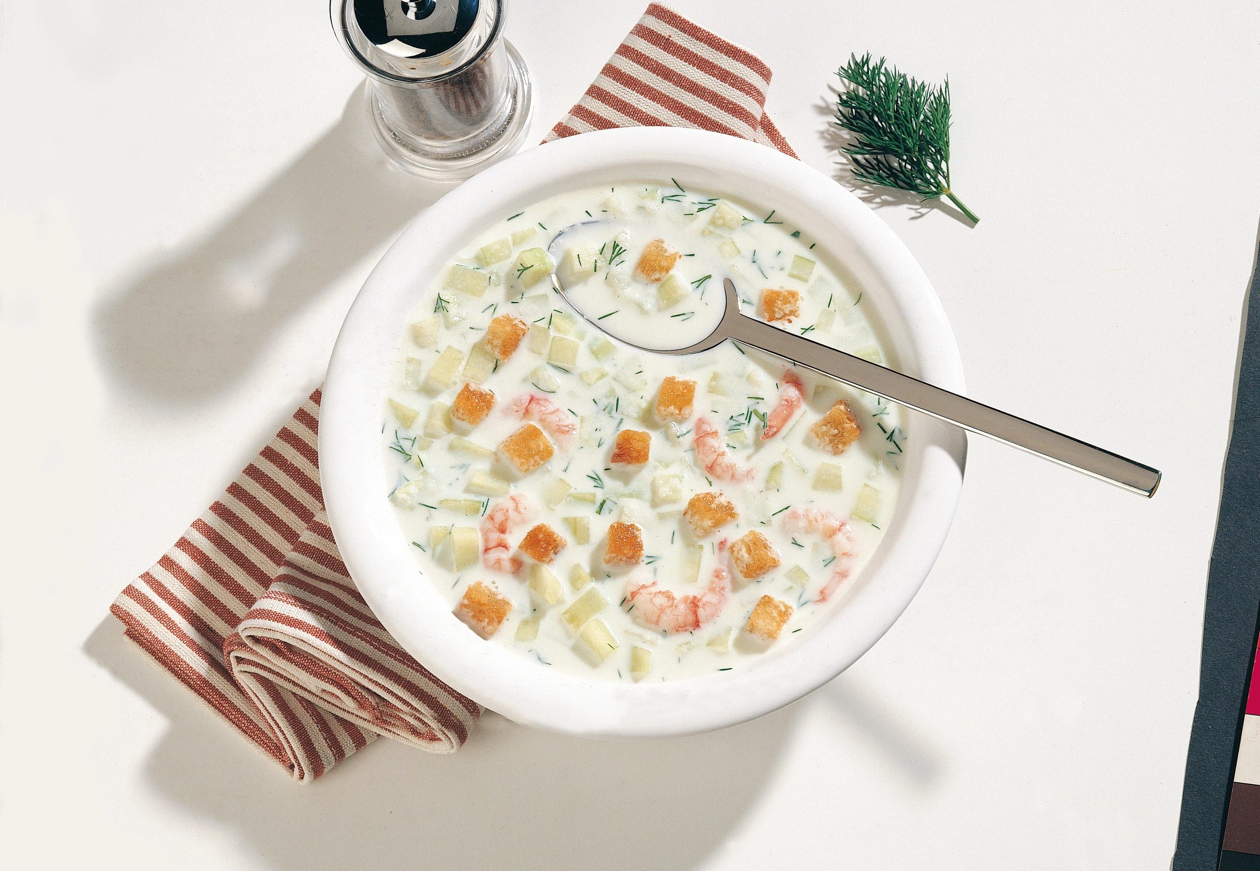Zwiebel und geraspelte Gurken mit Salz, Pfeffer, zerdrücktem Knoblauch und Zitronensaft würzen, Suppe und Obers zugießen und die Masse mit einem Stabmixer feinst pürieren. Garnelen, Gurkenwürfel und Dille untermischen. Suppe kaltstellen.