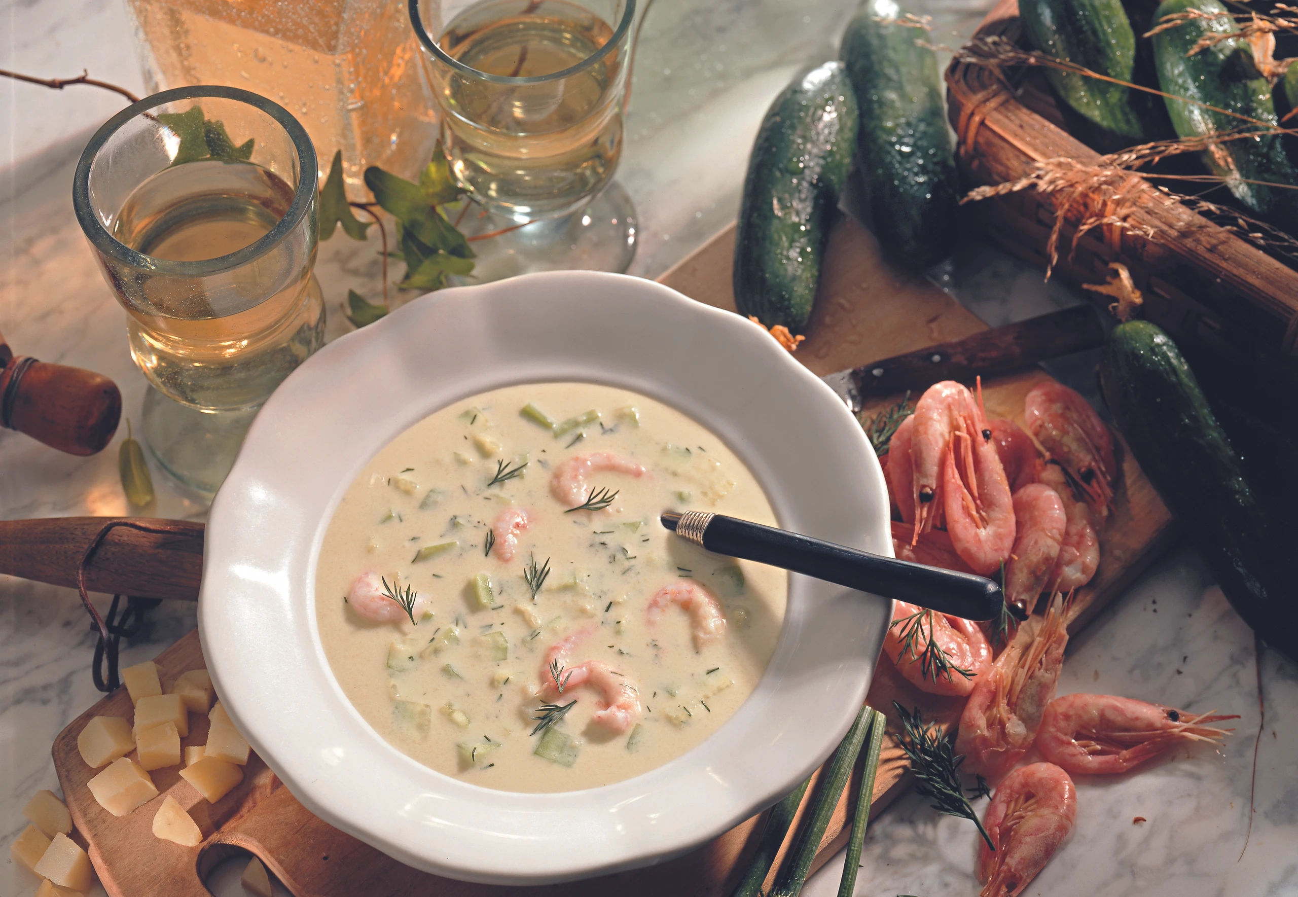 Erdäpfel schälen und in Würfel schneiden. Erdäpfel, Shrimps, Dille und Gurkenwürfel in die Suppe rühren. Suppe mit Salz und Pfeffer würzen, in gekühlten Tellern anrichten und mit Baguette servieren.