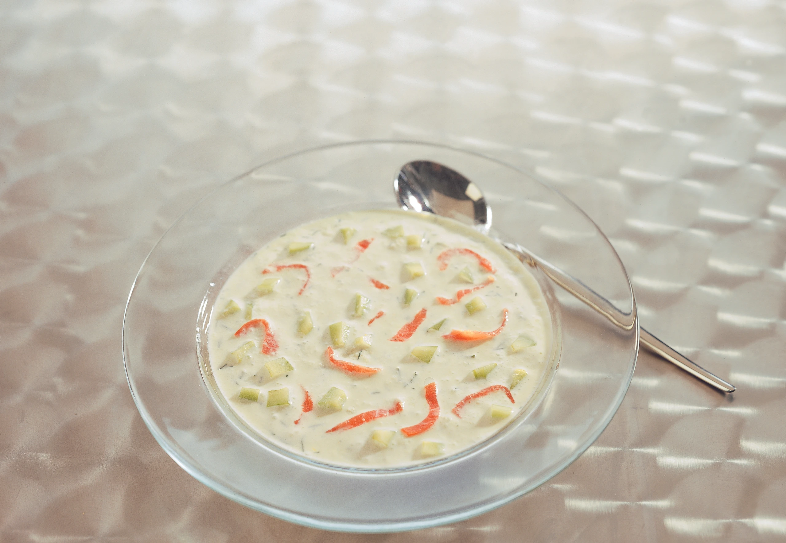 Kalte Gurkensuppe mit Räucherlachs und Dille