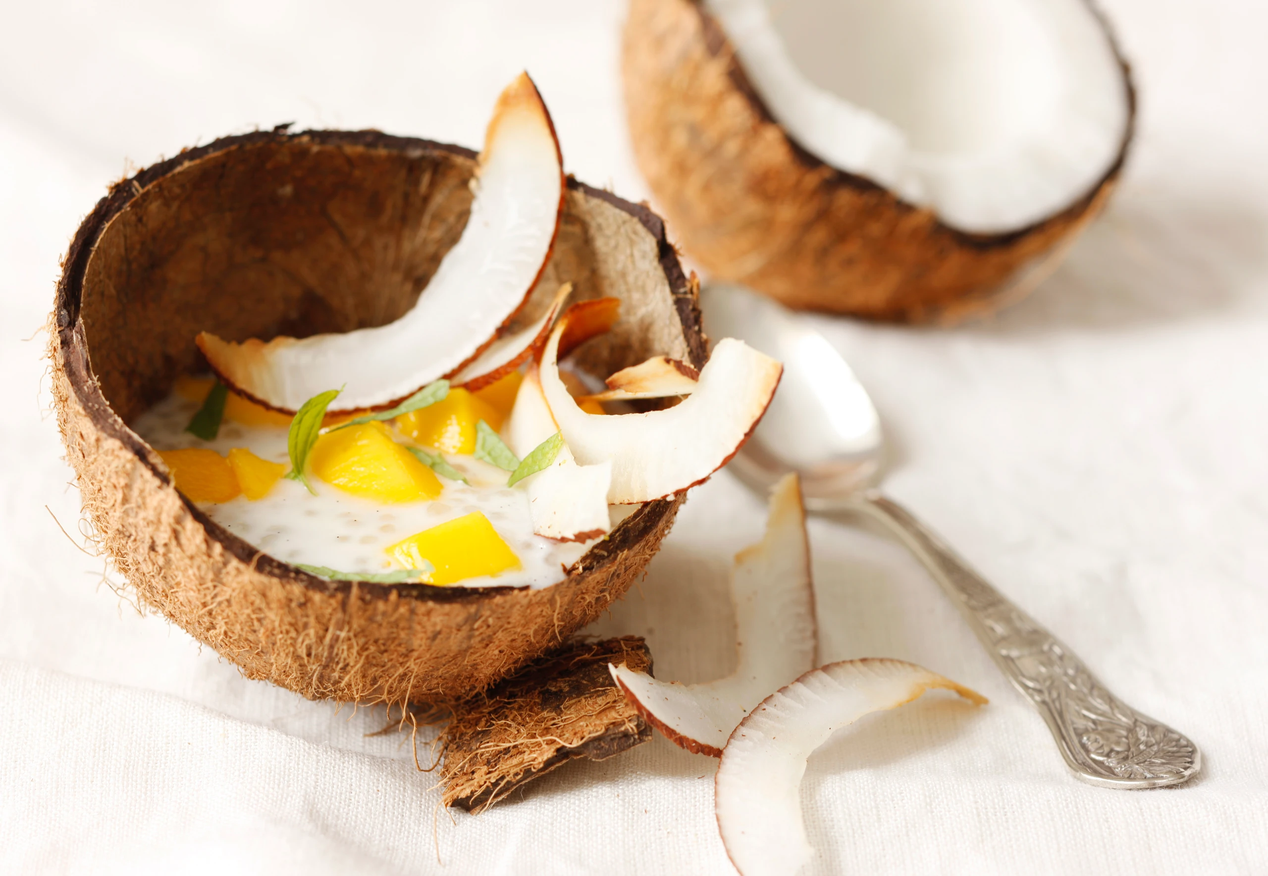 - Für die Einlage Rohr auf 180°C vorheizen. Backblech mit Backpapier belegen. Kokosfruchtfleisch in dünne Spalten schneiden, auf das Blech legen, im Rohr (mittlere Schiene) 10 Minuten backen und herausnehmen.