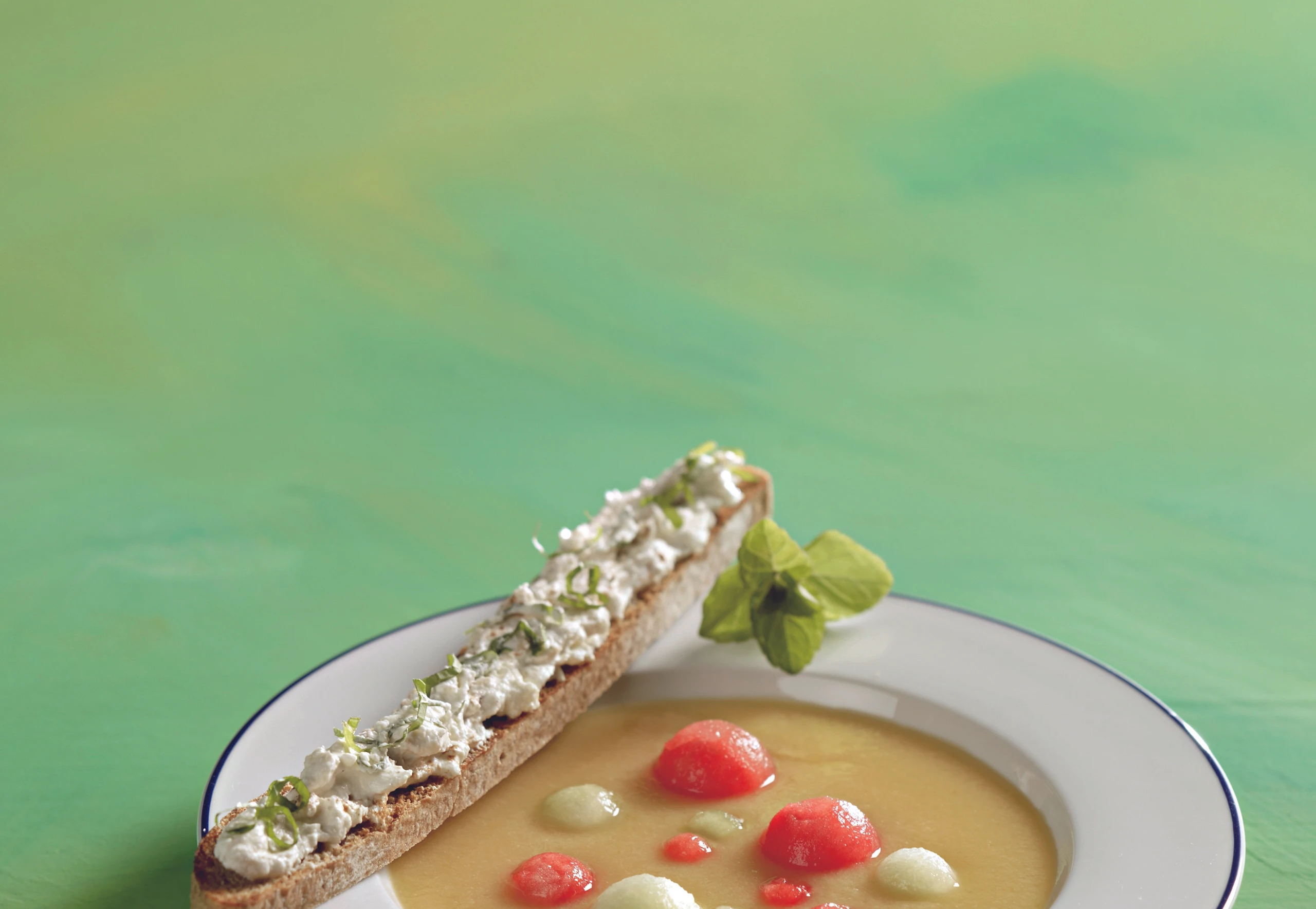 Kalte Melonen-Suppe mit Kräuter-Crostini