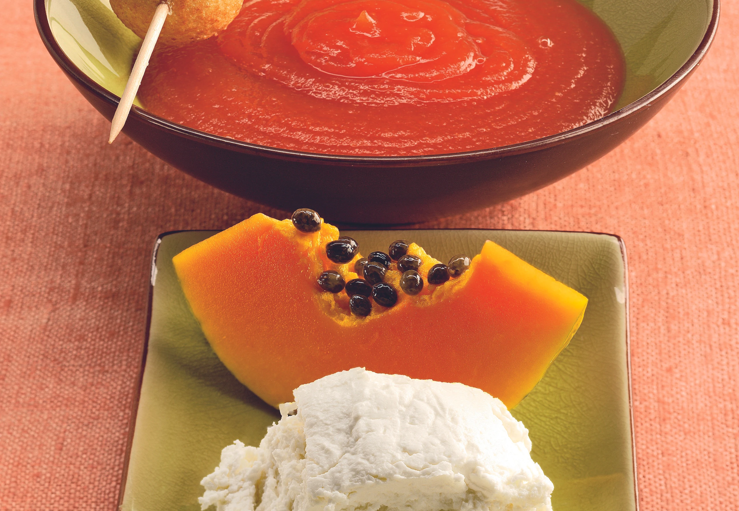 Kalte Papayasuppe mit Ziegenkäsebällchen