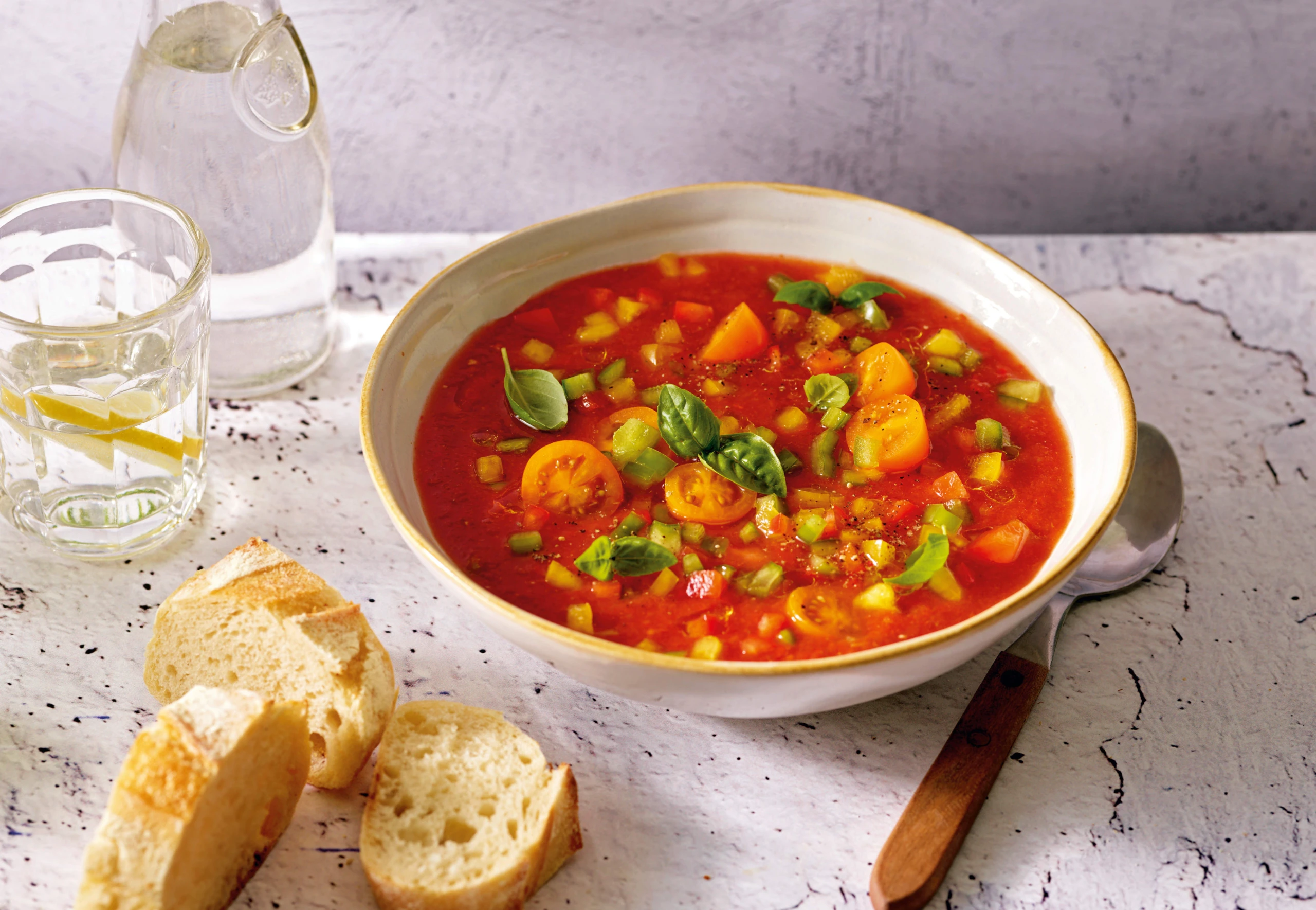Kalte Paradeiser-Paprikasuppe mit Basilikum
