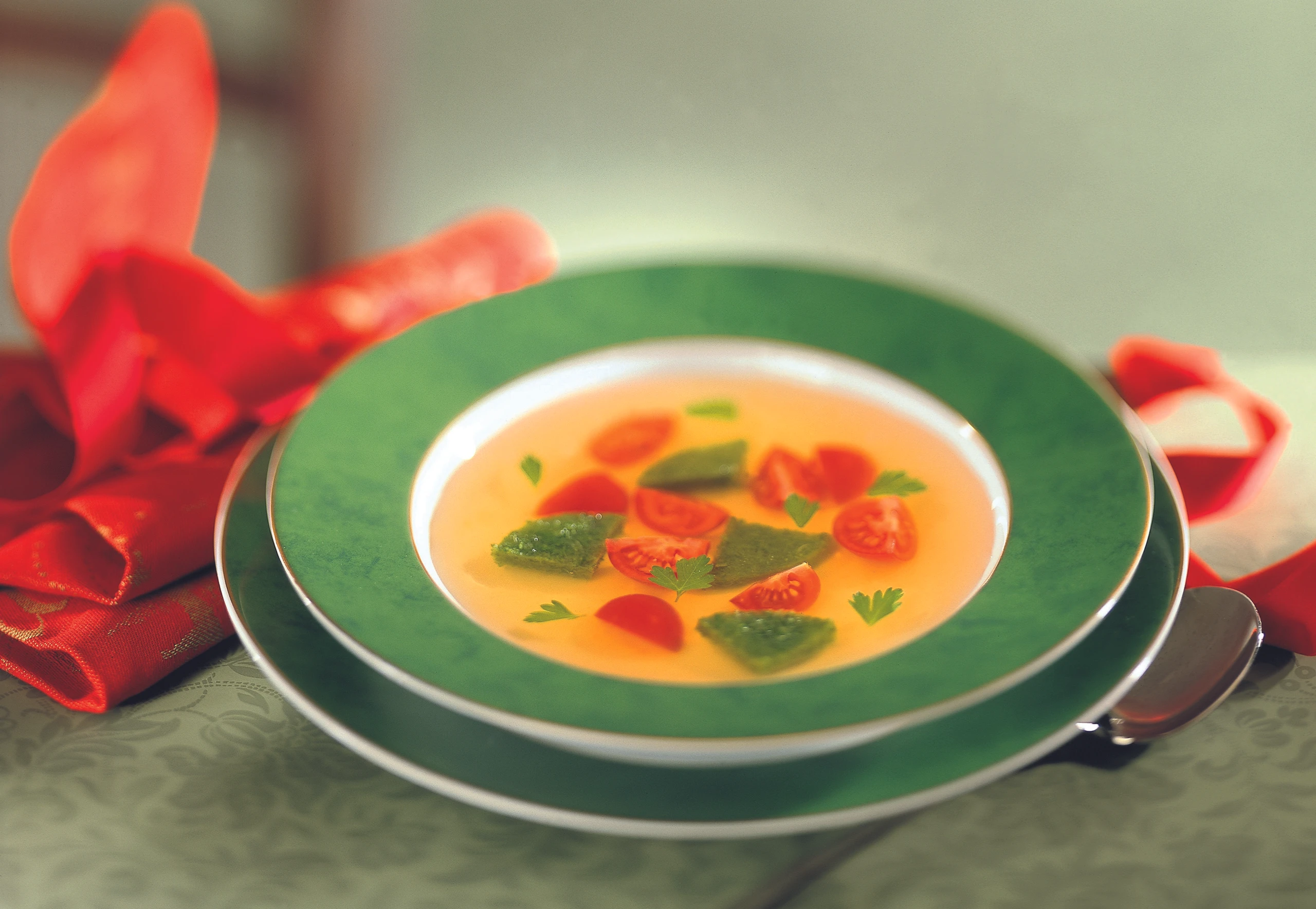Für die Einlage Paradeiser vierteln. Petersilmus aus dem Förmchen stürzen und in gleich große Stücke schneiden. Suppe in gekühlte Teller schöpfen, mit Petersilmus, Paradeisern und Petersilblättchen garniert servieren.