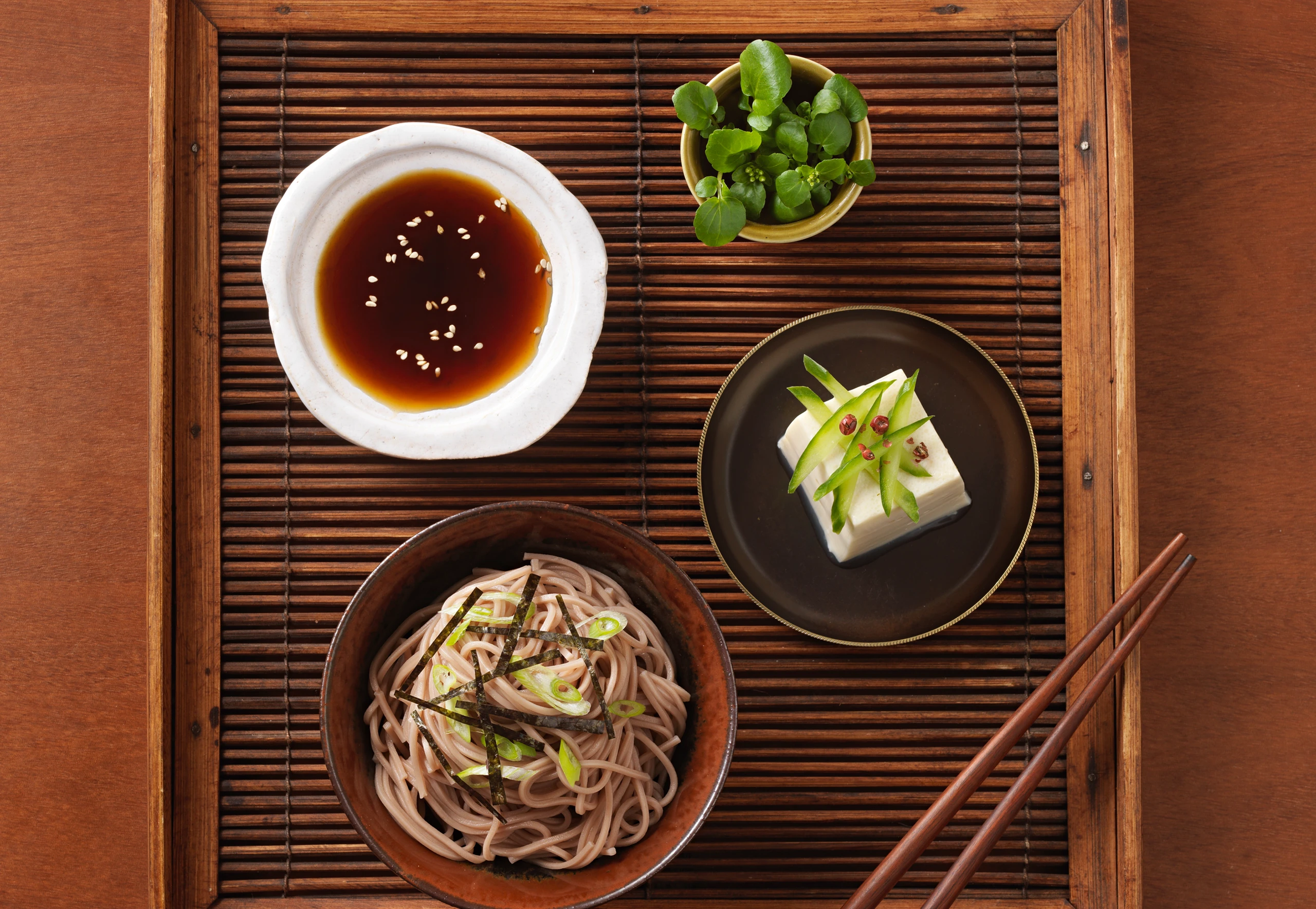 Abwechselnd Soba-Nudeln und Seidentofu Biss für Biss in den Dip tauchen. Brunnenkresse dazu essen.Aus dem Heft: