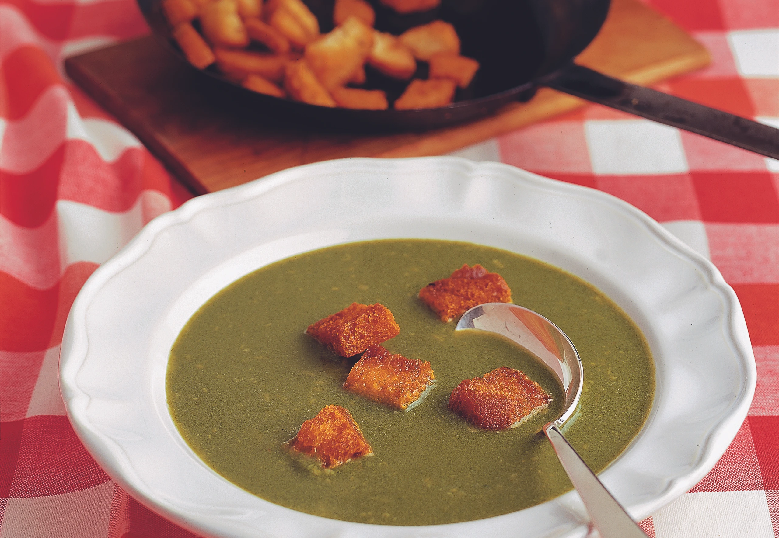Kalte Spinatsuppe mit gebratenen Semmelwürfeln