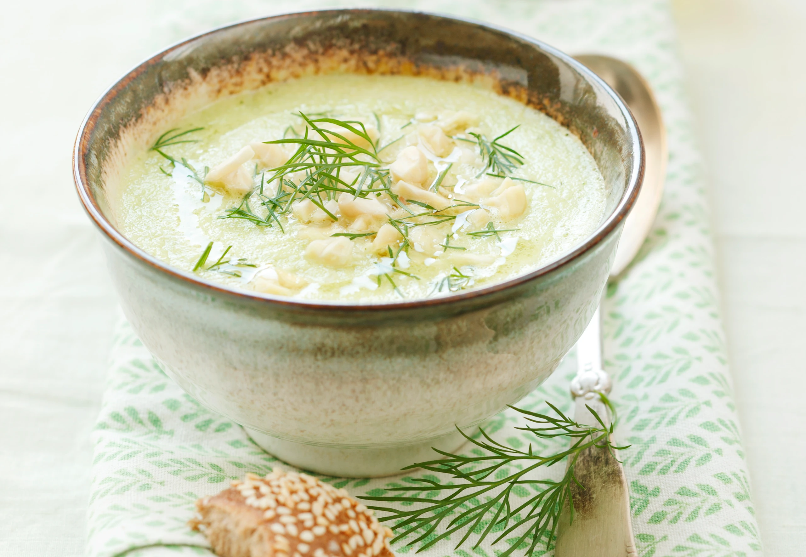 Suppe in gekühlten Tassen oder Gläsern anrichten, mit Dille und Mandeln bestreuen und mit übrigem Öl beträufelt servieren.