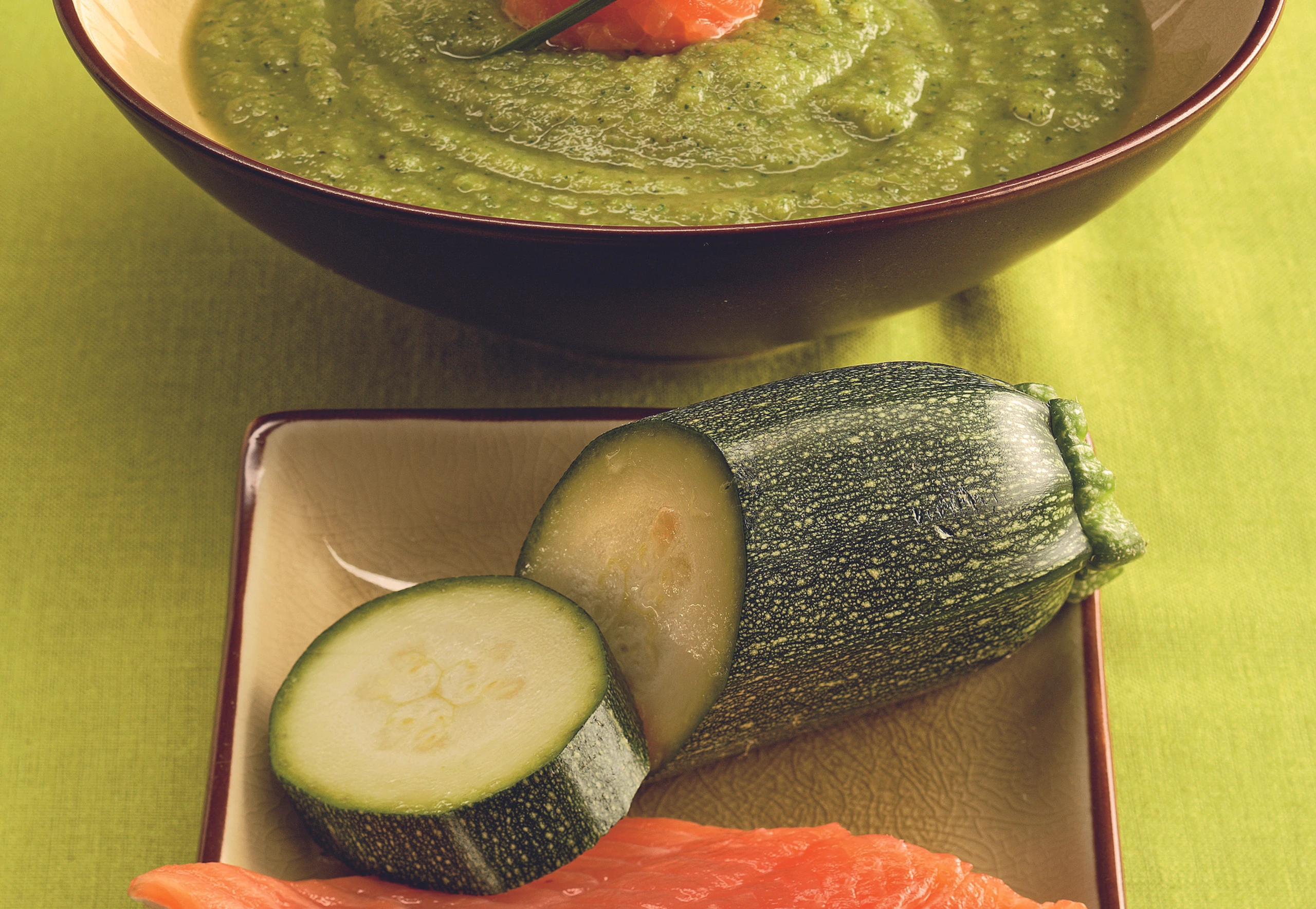 Kalte Zucchinisuppe mit Lachsforellenrose