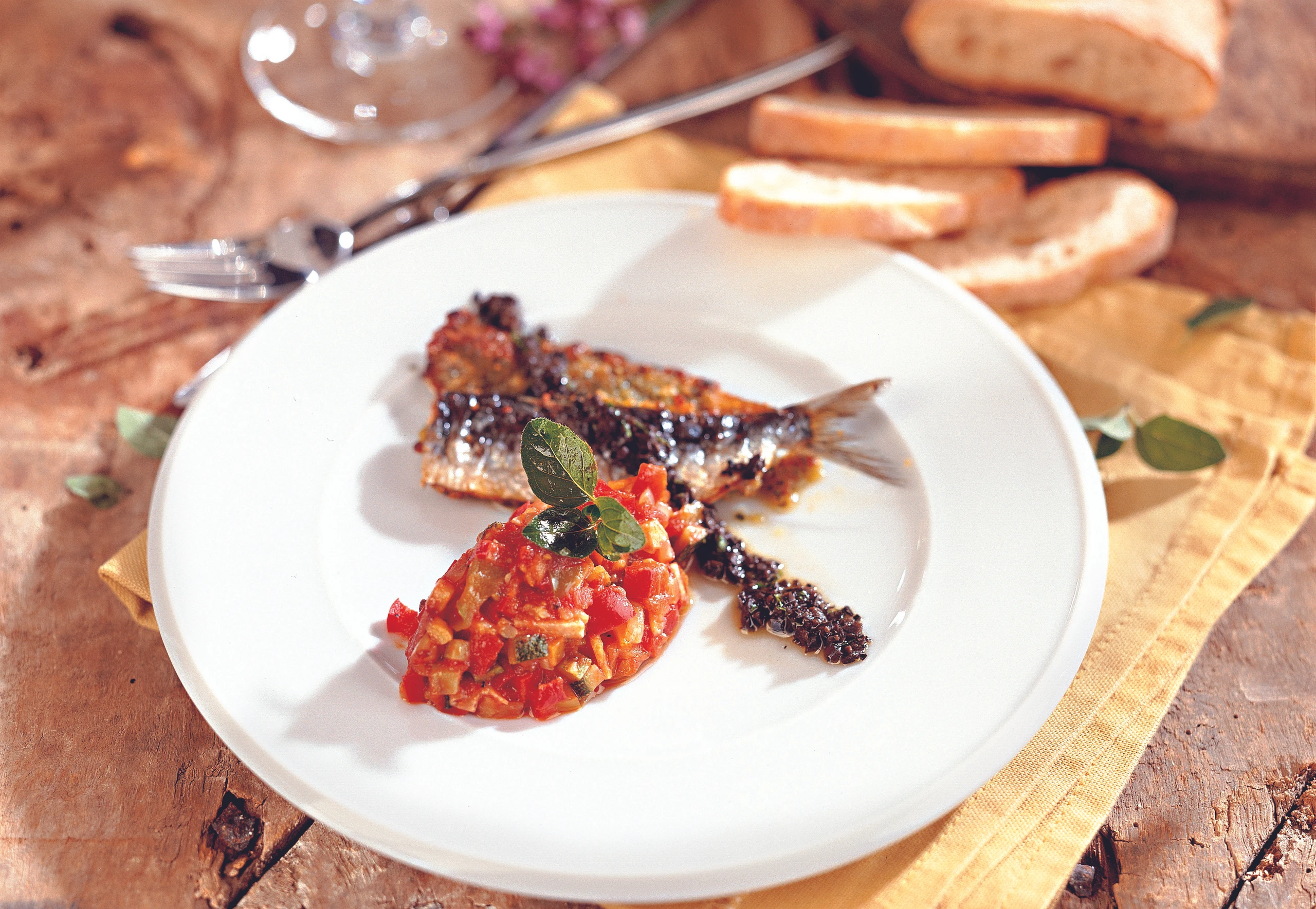 Sardinen mit Ratatouille und Olivenkaviar anrichten.