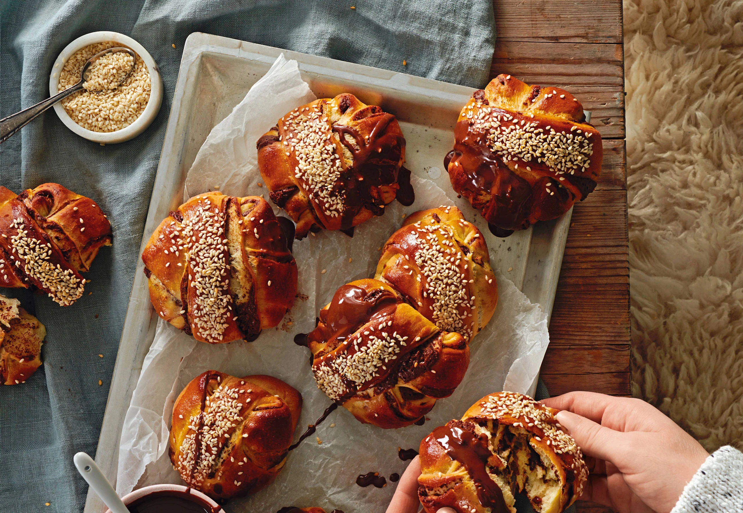Kanelbullar herausnehmen und mit der übrigen Schoko-Sesam-Glasur beträufeln. Noch warm genießen.
