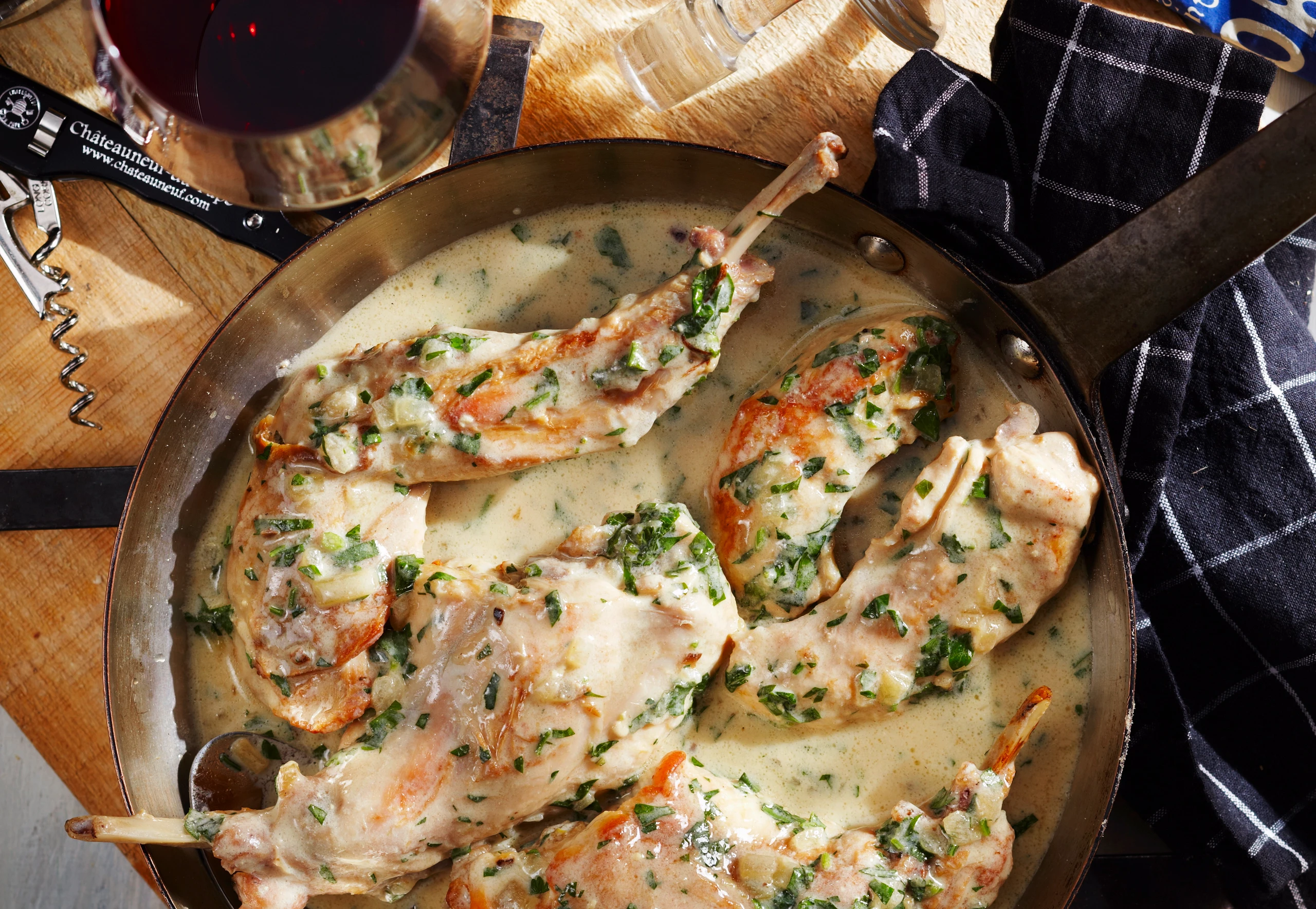 Kaninchen mit der Sauce anrichten und mit den Kräutern bestreut servieren. Dazu passt Baguette.