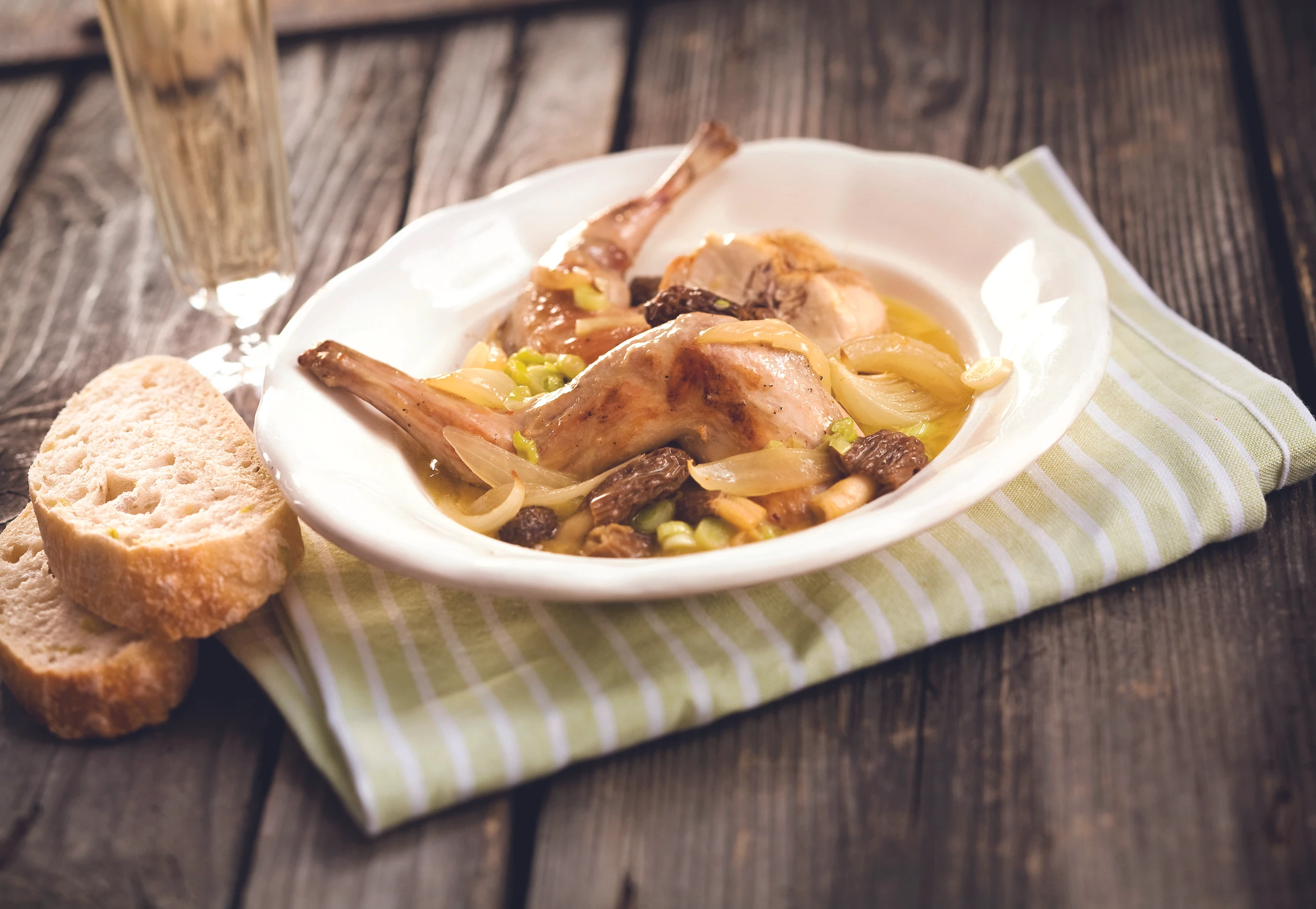 - Morcheln, Jungzwiebeln und Rückenstücke zu den geschmorten Kaninchenstücken geben, kurz ziehen lassen. Fleischstücke herausnehmen. Restliche Butter in die Sauce rühren, so dass diese leicht bindet (Sauce nicht mehr kochen!). Kaninchen mit Sauce und Weißbrot servieren.