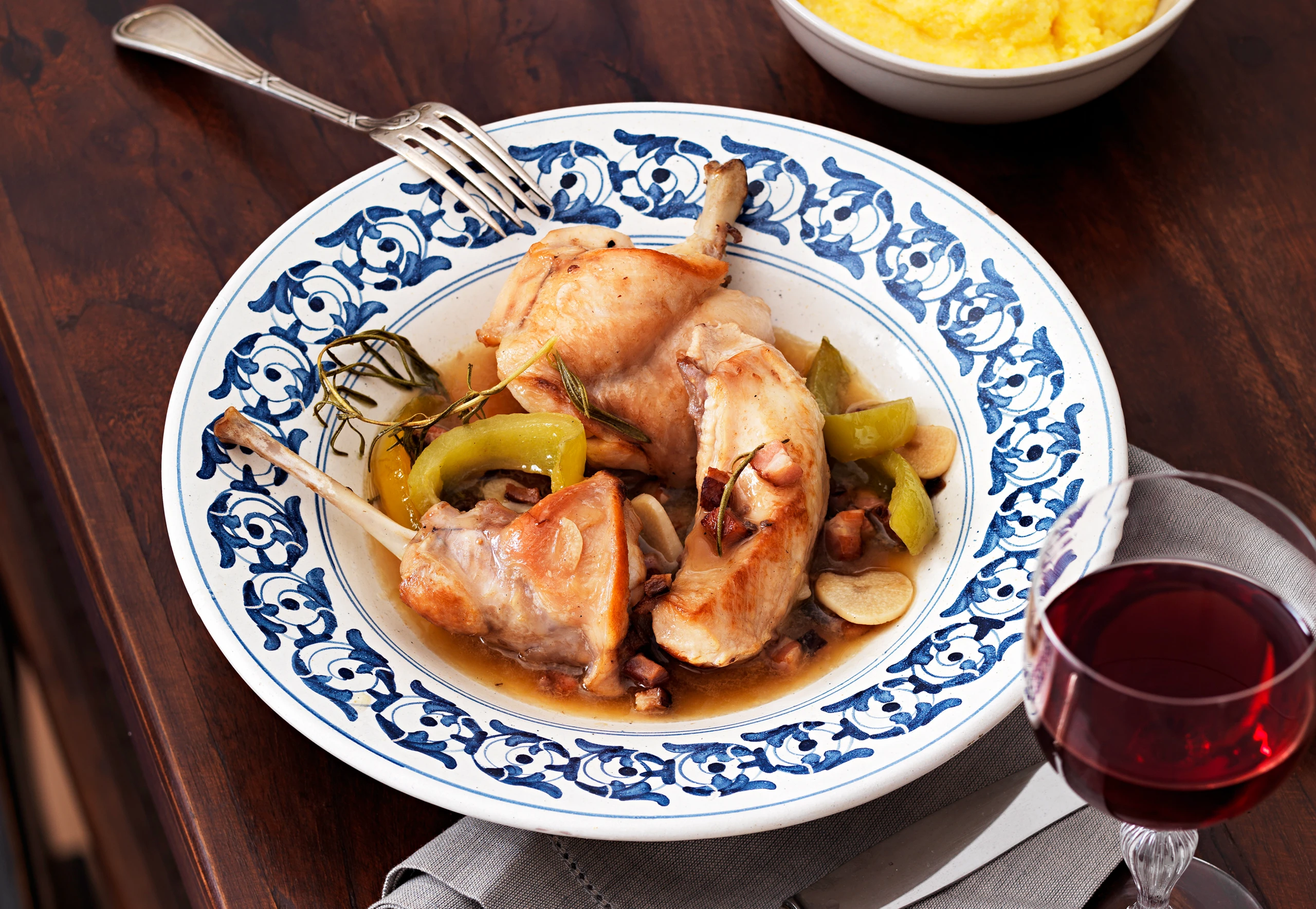 - Paprikamischung zum Kaninchen geben, Kaninchen weitere 15 Minuten schmoren. Dazu passt Polenta.