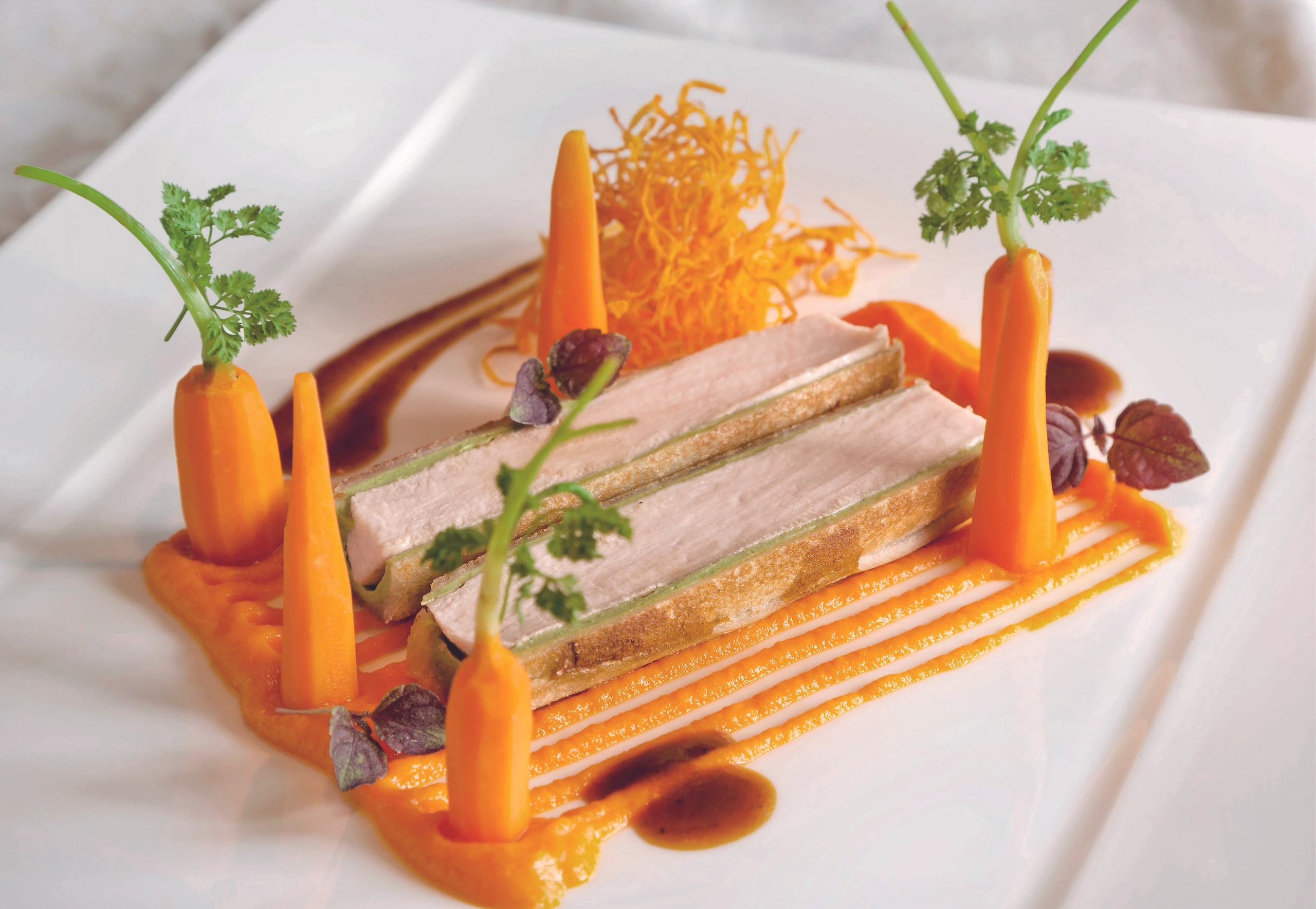 - Karottenpüree auf die Teller streichen. Kaninchenfilets der Länge nach aufschneiden, auf das Püree setzen, mit Kaninchenjus und Minikarotten garniert servieren. Eventuell zusätzlich mit gebackenen Karottenstreifen und Kräuterblättchen garnieren.