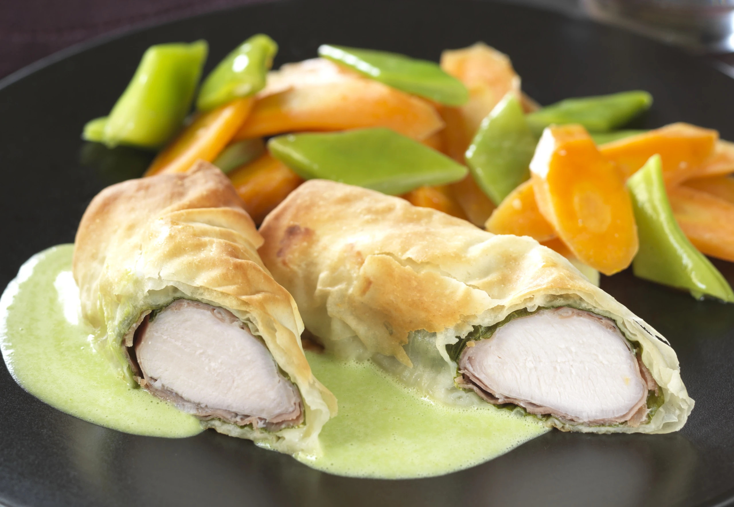 Filets quer in Stücke schneiden und mit Sauce und Gemüse anrichten.