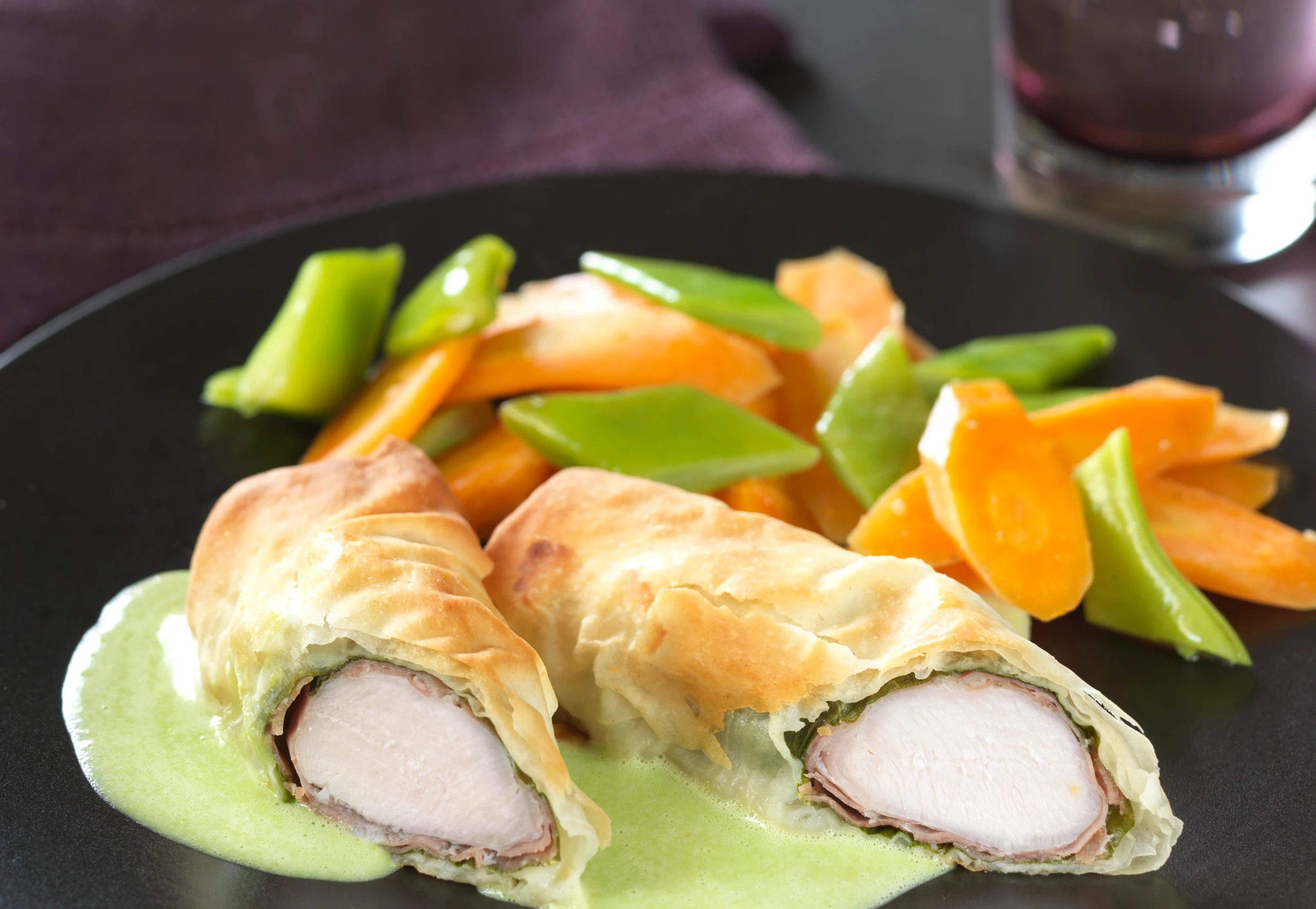 - Vom Spinat grobe Stiele entfernen. Spinat in Salzwasser kurz überkochen, abseihen, abschrecken und behutsam ausdrücken. Kaninchenfilets mit Salz und Pfeffer würzen. Jedes Filet mit 2 Scheiben Rohschinken und 1 Spinatblatt umwickeln.