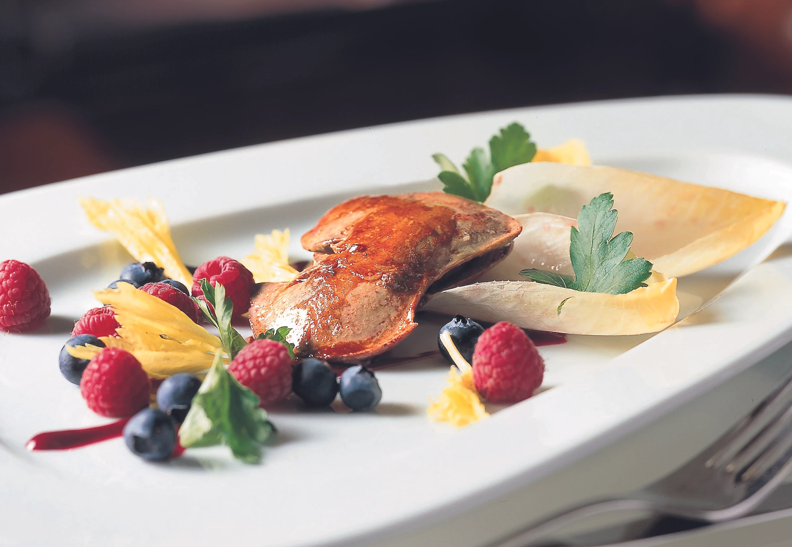 Kaninchenleber auf Salat und Himbeermark