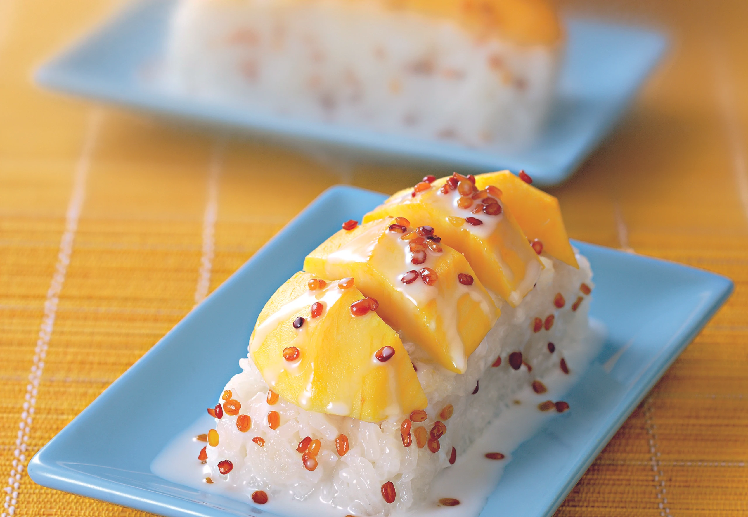 Mangos dünn schälen (Sparschäler), auf die Spitze stellen, Fruchtfleisch in 2 Stücken vom Kern schneiden. Am Kern verbliebenes Fruchtfleisch ebenfalls abschneiden. Fruchtfleisch in Streifen schneiden. Reis mit Mangos und Mungobohnen servieren.
