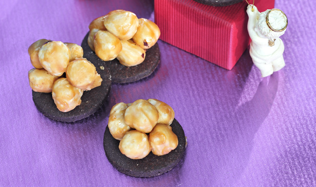 In einem Topf Kristallzucker bei mittlerer Hitze zu hellem Karamell schmelzen, mit Obers aufgießen. So lange köcheln, bis sich der Karamell aufgelöst hat und eine dicke Masse entstanden ist. Haselnüsse vorsichtig unterrühren. Nüsse mit einem Löffel auf die Teigböden setzen und auskühlen lassen.