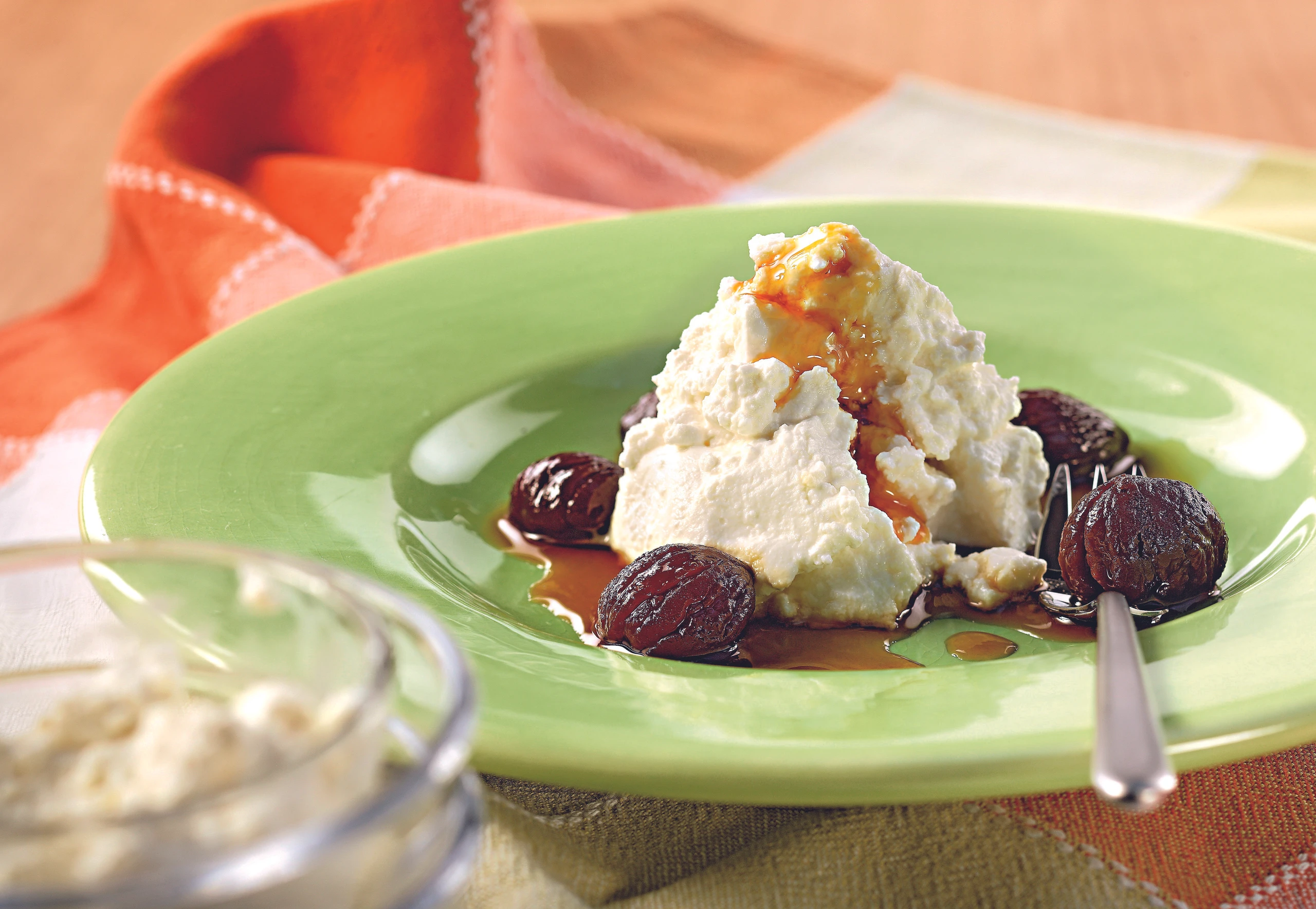 Karamell-Maroni abkühlen lassen, bei Raumtemperatur mit dem Ricotta anrichten.