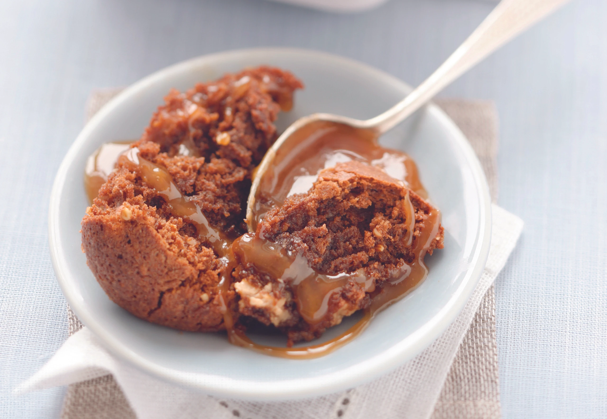 Eiklar und Kristallzucker zu cremigem Schnee schlagen. Schnee und Weichkaramell unter die Schokomasse heben.