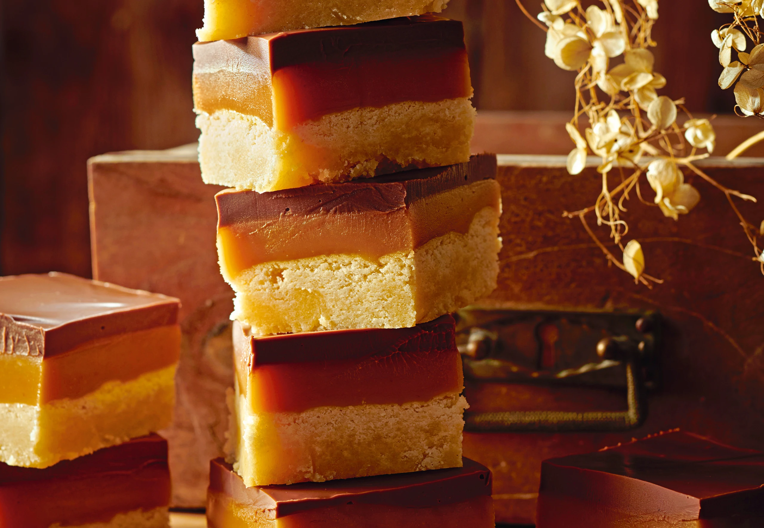 Für die Karamellschicht Zucker, Glykose, Butter und Kondensmilch in einem Topf verrühren. Bei schwacher Hitze unter ständigem Rühren erwärmen, bis die Masse goldbraun ist (das kann bis zu 25 Minuten dauern). Karamell sofort auf dem Shortbread verstreichen und im Kühlschrank ca. 1 Stunde anziehen lassen.