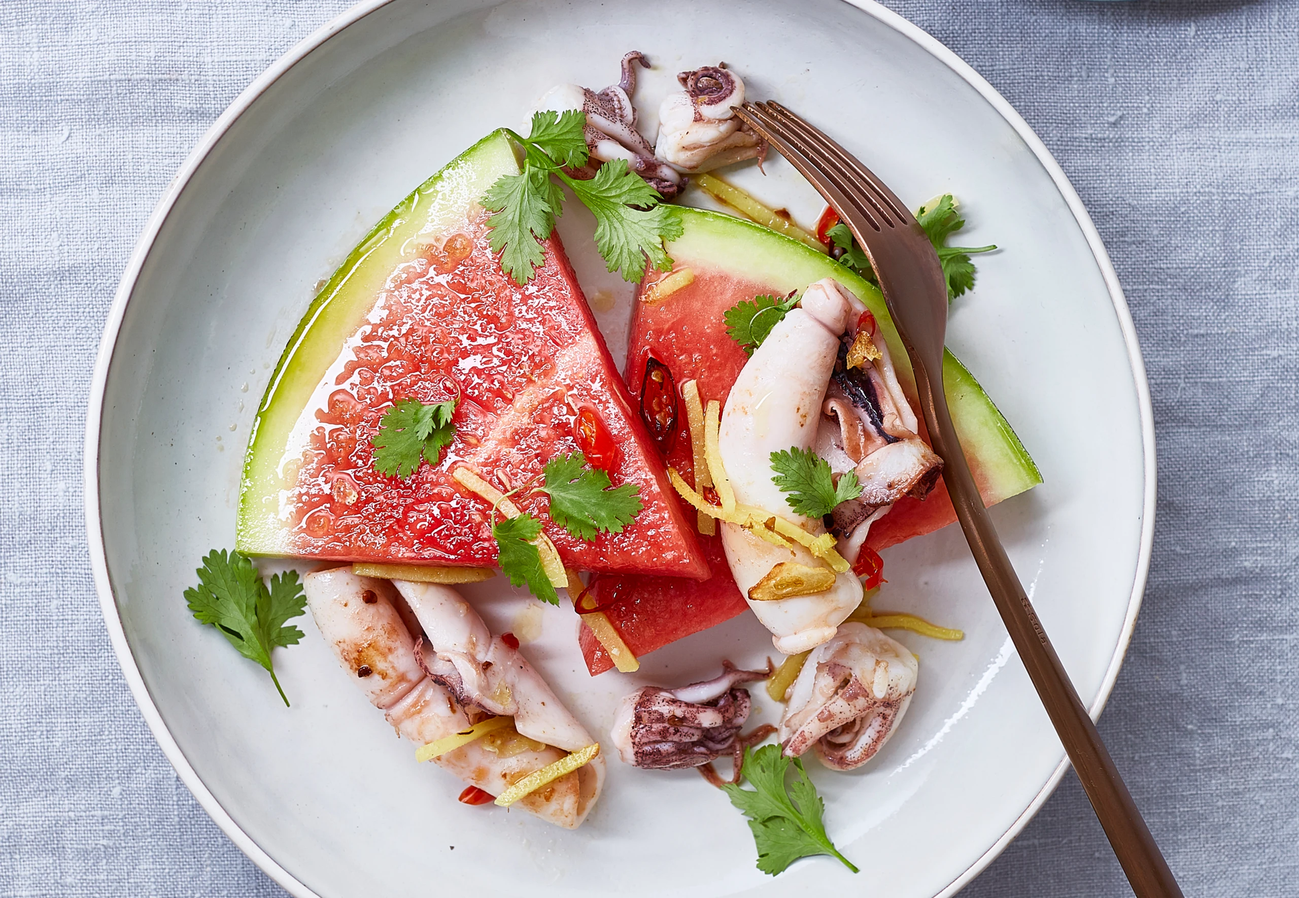 Wassermelonen mit Calamari, Ingwer, Knoblauch und Chili anrichten und mit Koriander bestreuen.