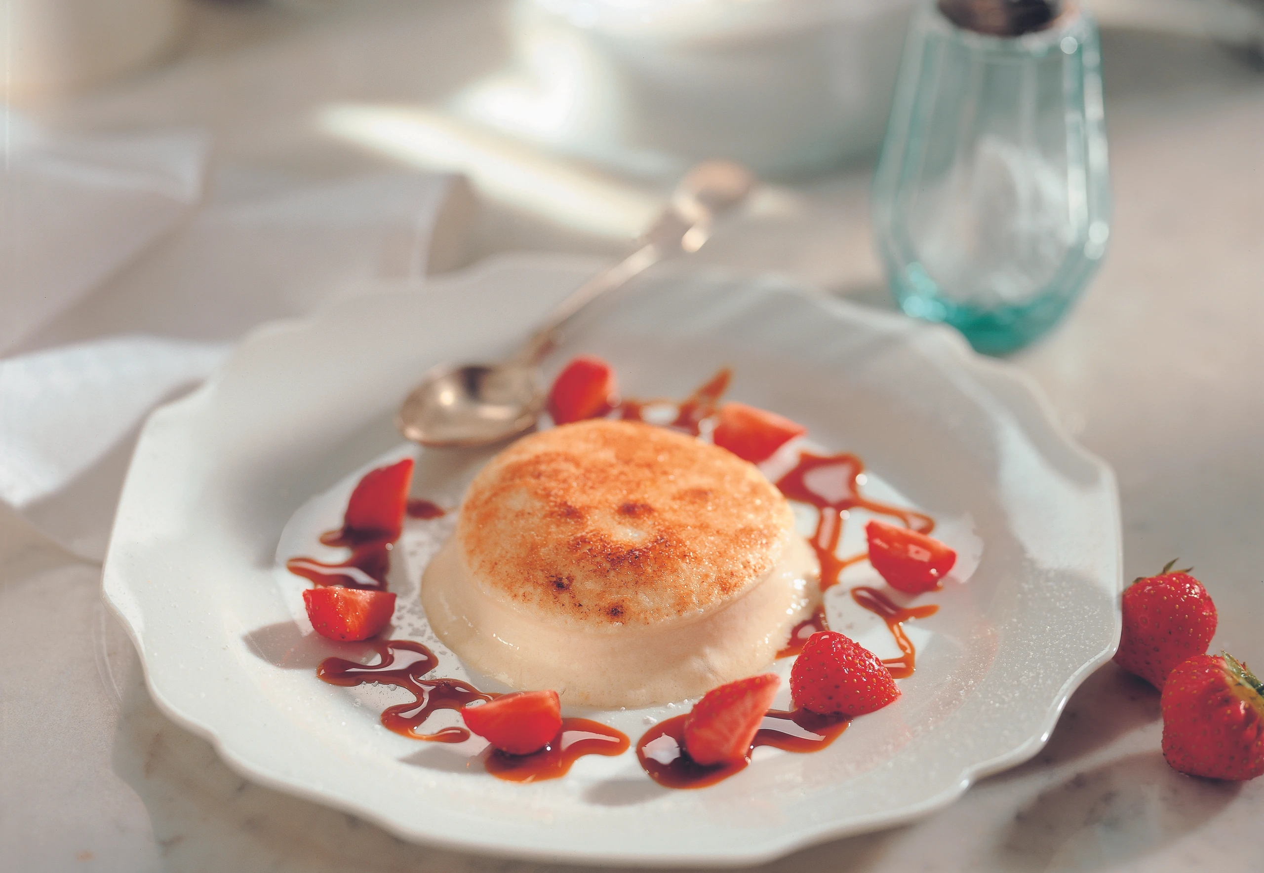 Für die Garnitur Erdbeeren putzen und vierteln. Backrohr auf Grillstellung vorheizen. Förmchen kurz in heißes Wasser tauchen, Törtchen auf Teller stürzen, dick mit Staubzucker bestreuen und nacheinander im vorgeheizten Rohr goldbraun überbacken (dauert 1–2 Minuten; siehe auch Tipp). Törtchen mit Karamellsauce und Erdbeeren garnieren.