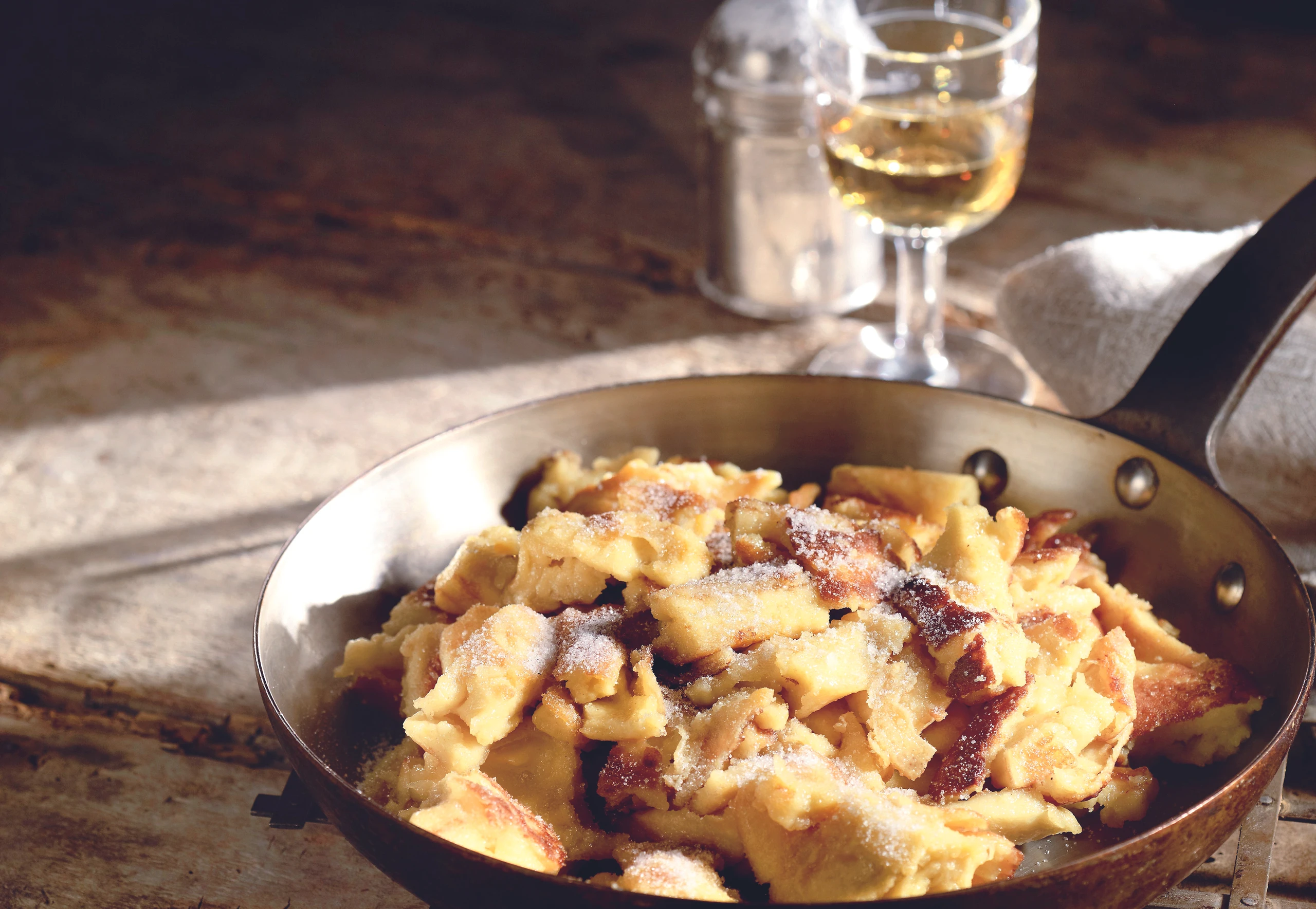In einer großen Pfanne (am besten aus Eisen) ein Drittel der Butter zerlassen. Teig eingießen, in der Pfanne verlaufen lassen und bei mittlerer Hitze goldbraun anbraten (ca. 6 Minuten, die Oberfläche bleibt dabei flüssig). Teig halbieren oder vierteln, wenden, ein weiteres Drittel der Butter zugeben und fertig backen (ca. 6 Minuten).