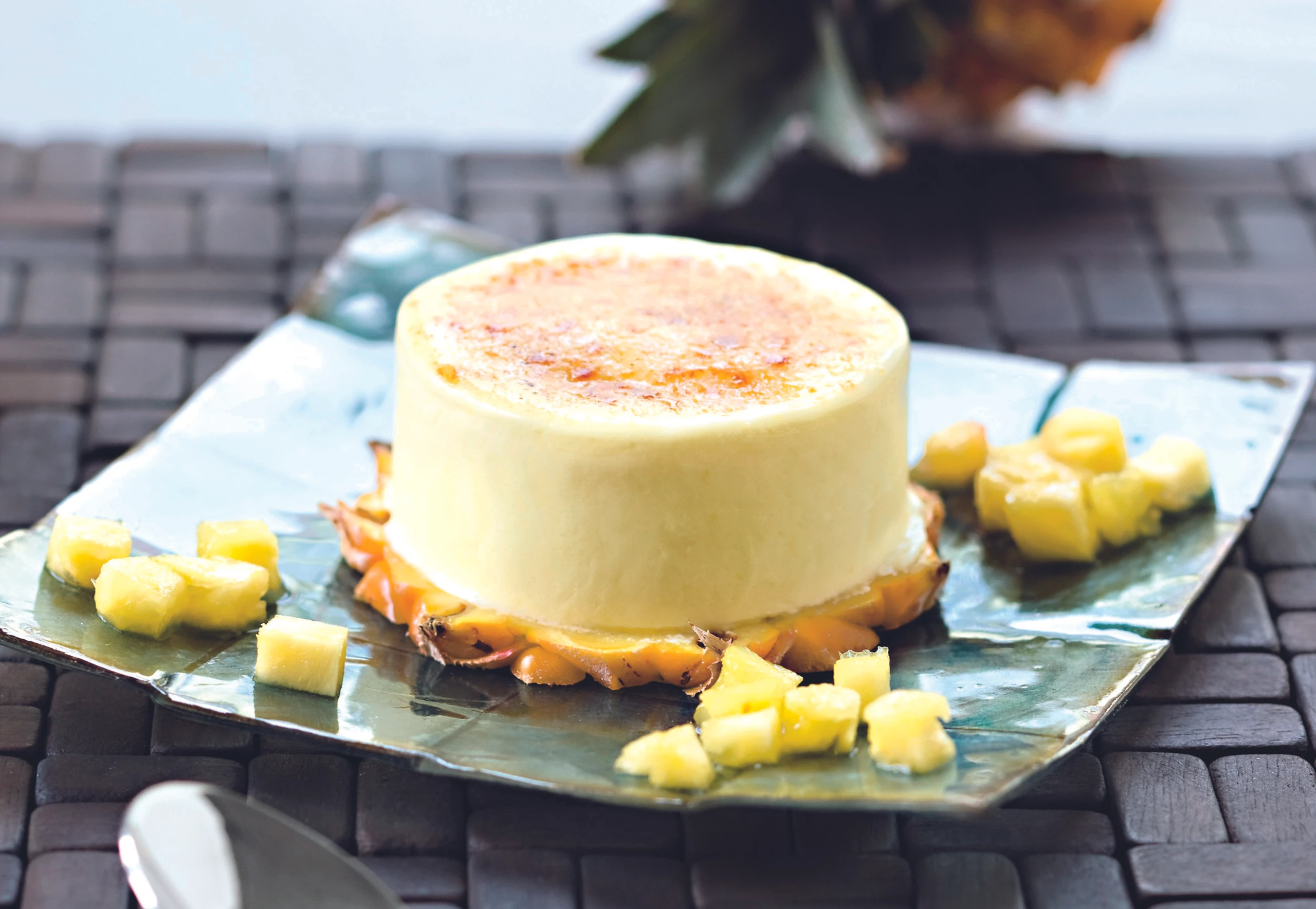 Förmchen in heißes Wasser tauchen. Parfaits auf die Ananasscheiben stürzen, mit Braunzucker bestreuen und flämmen. Mit Ananaswürfeln garnieren.