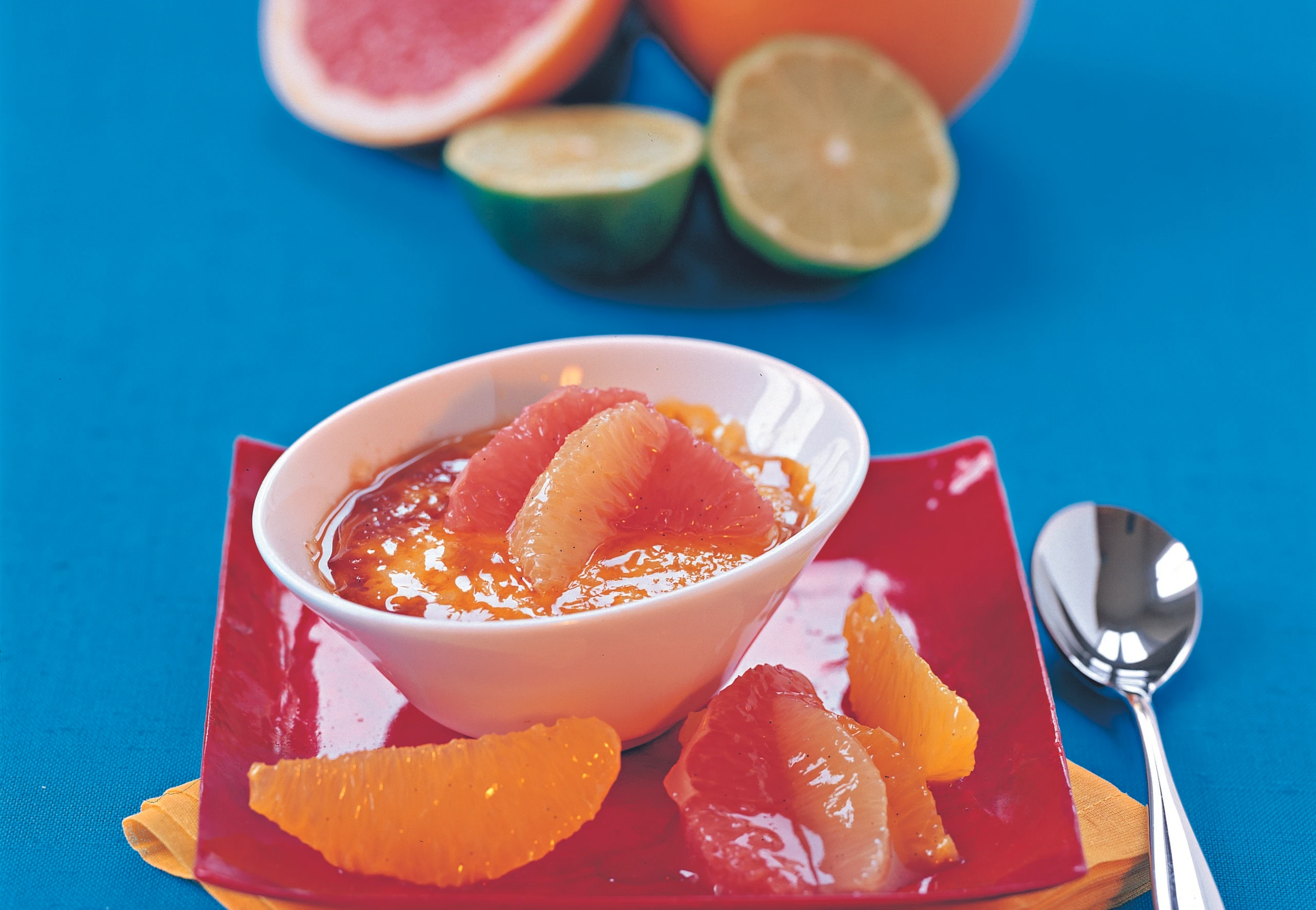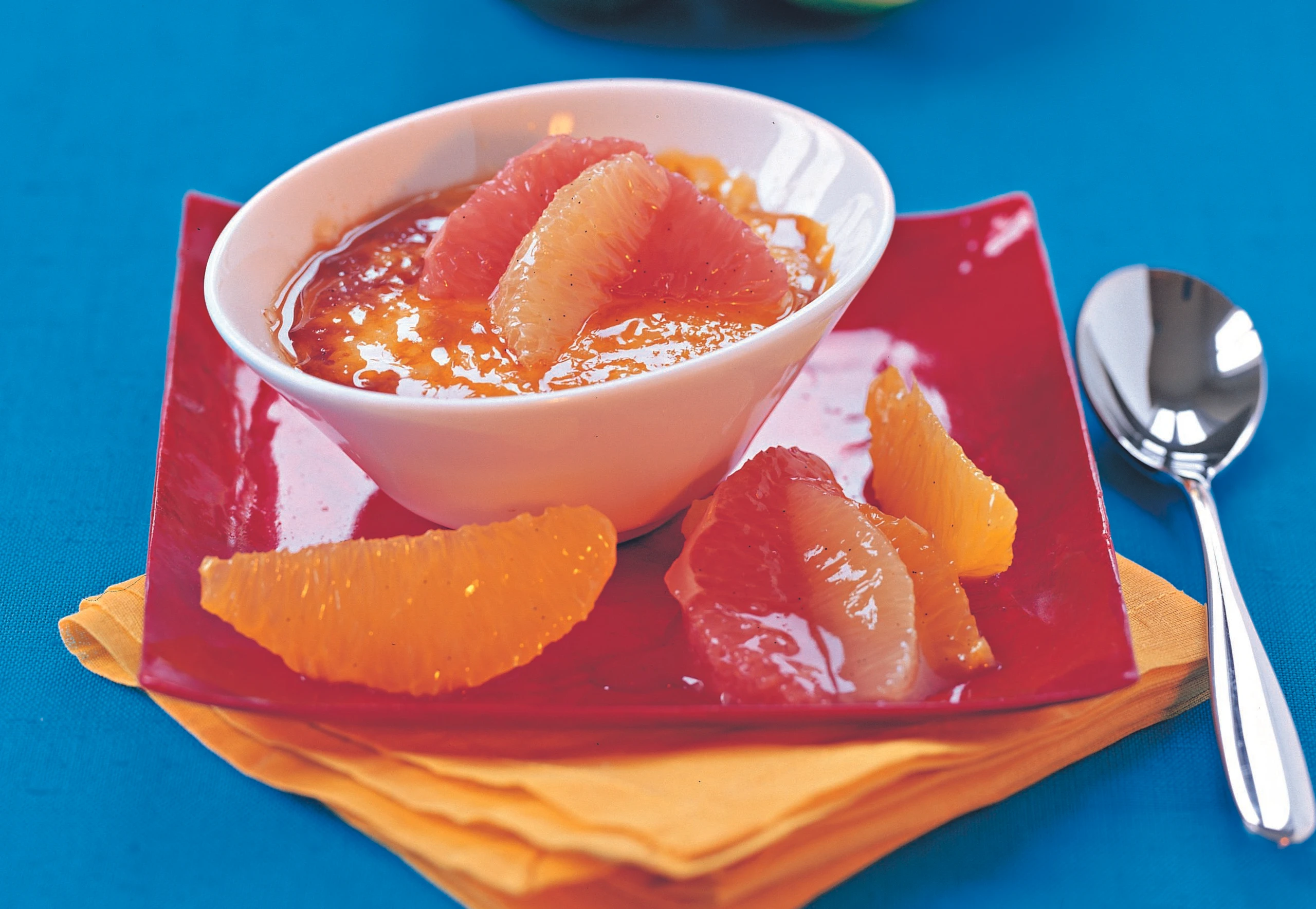 Rohr auf Grillstellung vorheizen (oder Flämmer bereitstellen). Grießkoch mit Zucker bestreuen und unter dem Grill oder mit dem Flämmer karamellisieren. Zitrus-Salat auf dem Grießkoch anrichten.