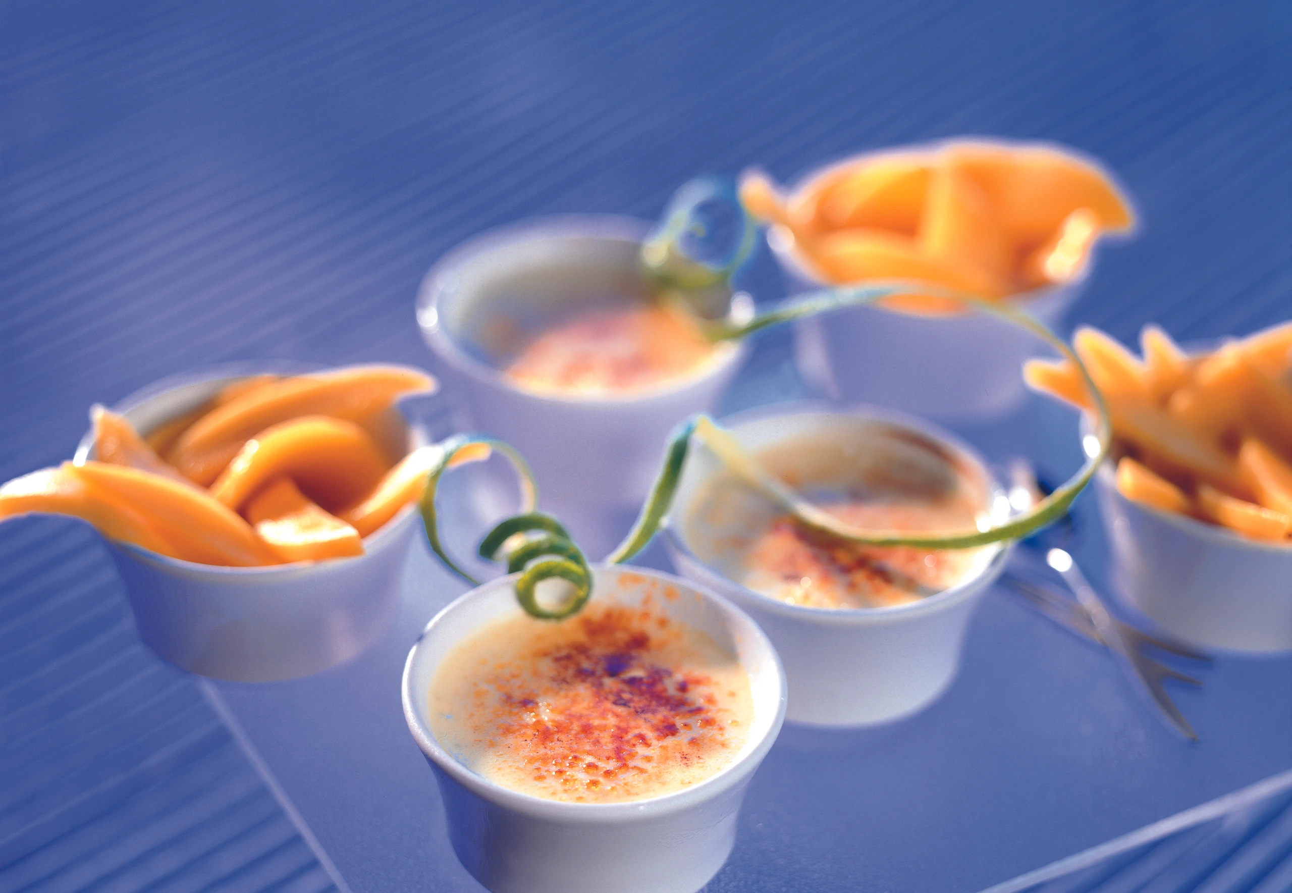 Parfaits dünn mit Rohrzucker bestreuen und mit einem Bunsenbrenner flämmen, bis der Zucker karamellisiert. Sofort servieren.