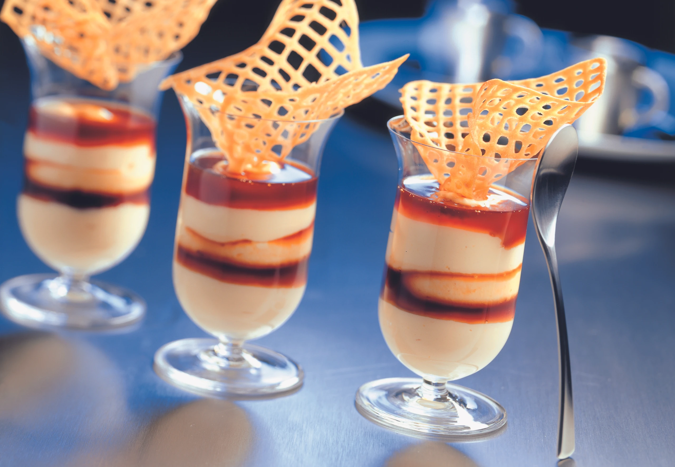 Karamell-Creme mit dem Schneebesen ganz vorsichtig (kurz!) glatt rühren. Abwechselnd Karamell- und Whisky-Creme in die Gläser füllen: die Karamell-Creme am besten mit einem Spritzsack mit glatter Tülle (Ø 1cm), die Whisky-Creme mit einen Löffel. Dessert mit den Hippen-Gittern garnieren.