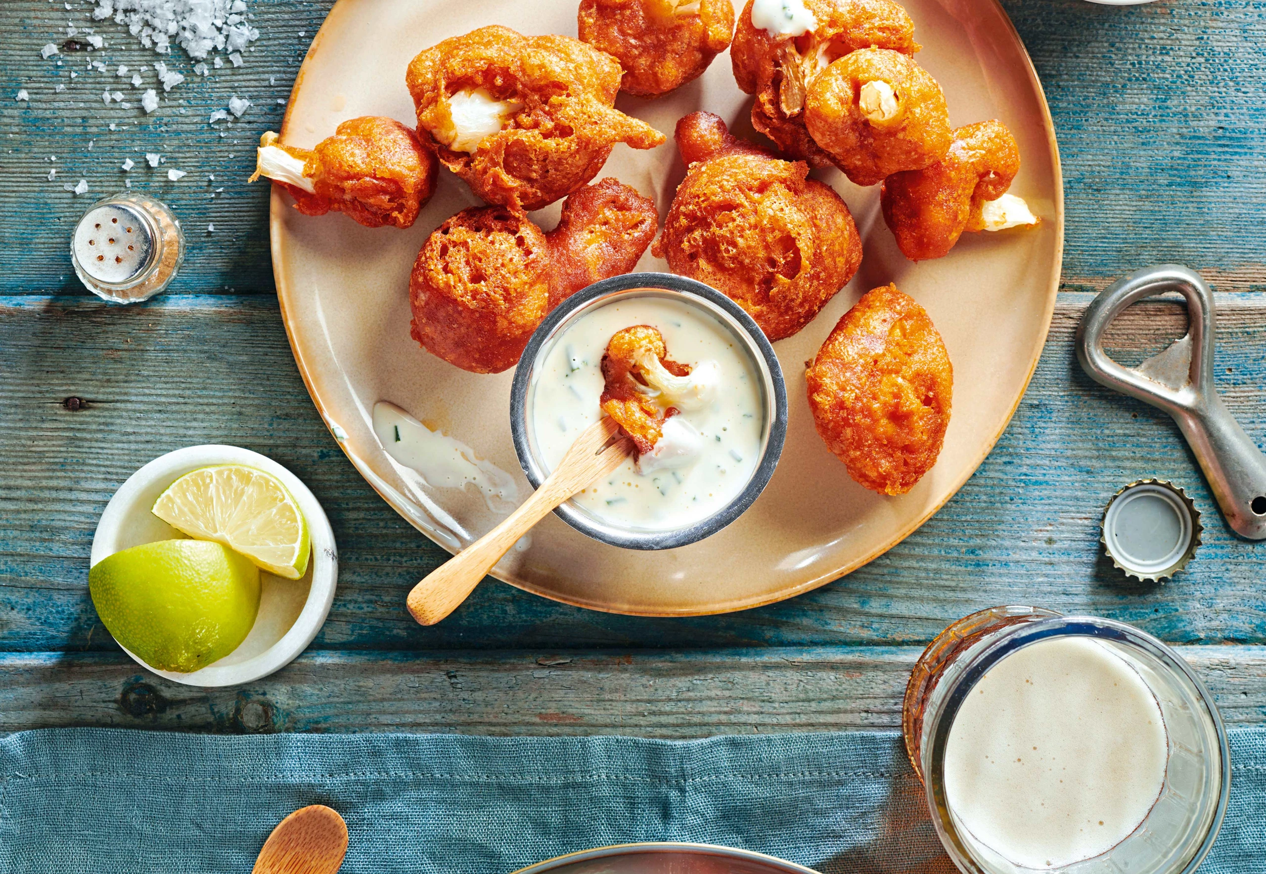 Für den Teig Mehl, Gewürze und Backpulver verrühren. Barbecuesauce und Bier zugeben und glatt rühren. Karfiol in den Teig tauchen, abtropfen lassen und im Öl knusprig frittieren. Auf einem Gitterrost abtropfen lassen.