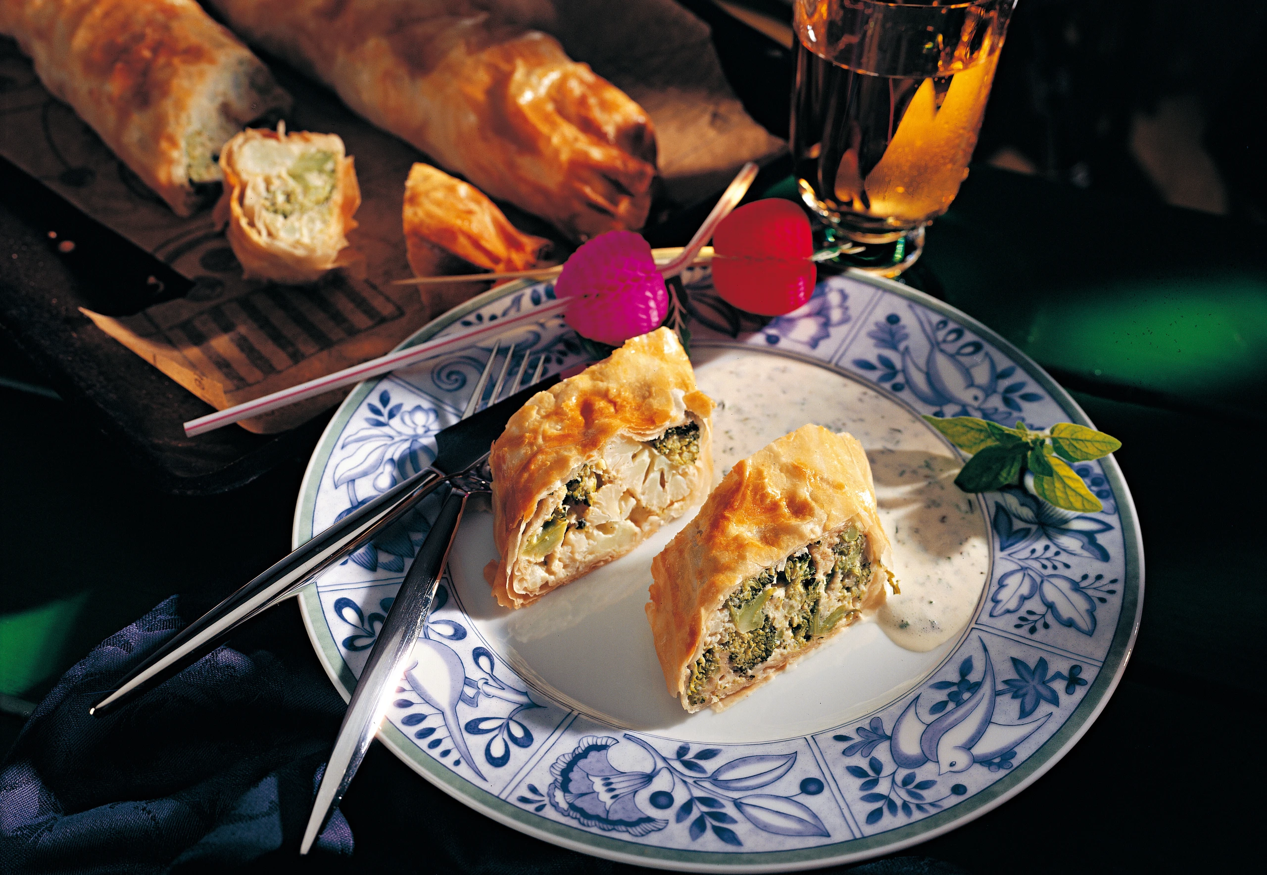 Strudelteig mit der Hälfte der Gemüsefülle belegen. Seitliche Teigränder einschlagen und den Teig über die Fülle einrollen. Strudel auf das Backblech setzen und mit Butter bestreichen. Ebenso restlichen Strudelteig und übrige Fülle verarbeiten.