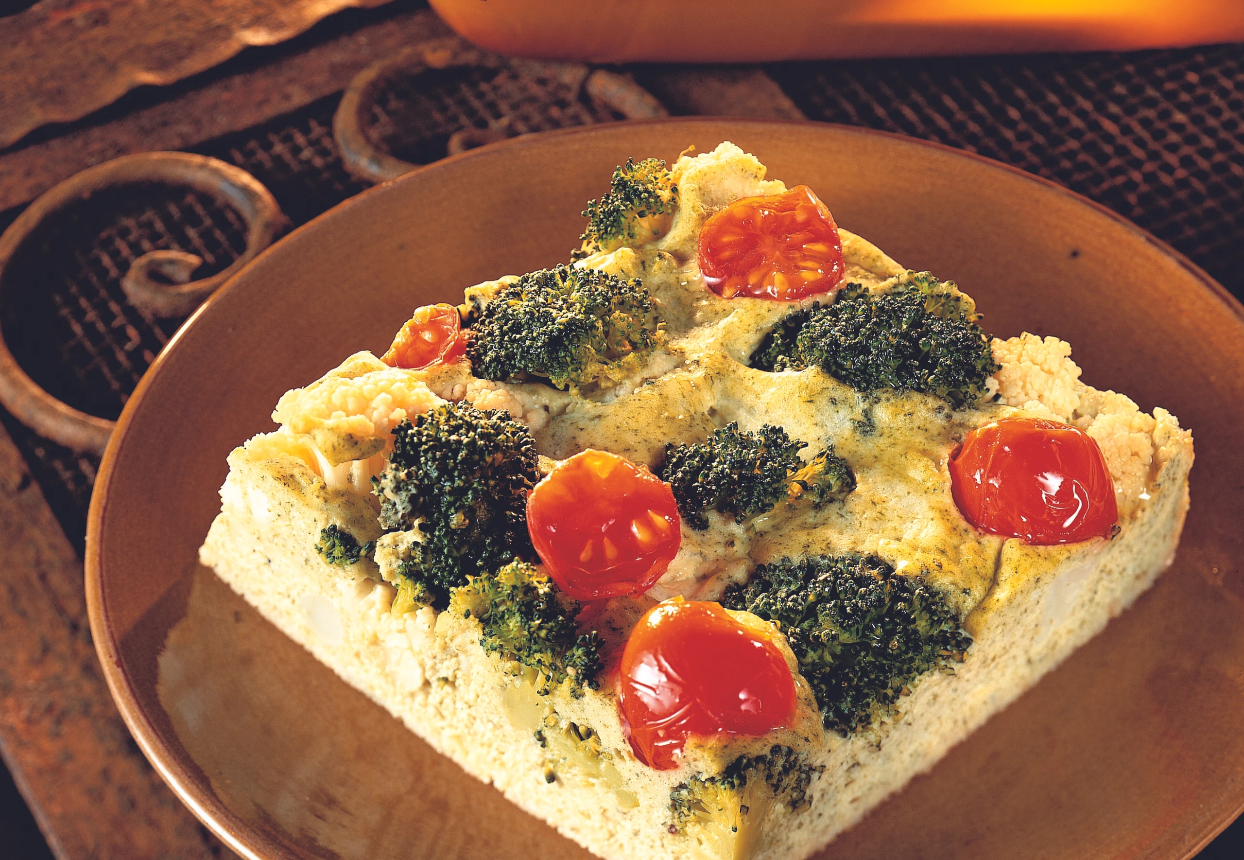 Eier, Sauerrahm, Petersilie, Brokkoli und Karfiol untermengen und die Masse mit Salz, Pfeffer und Muskatnuß würzen. Paradeiser halbieren.