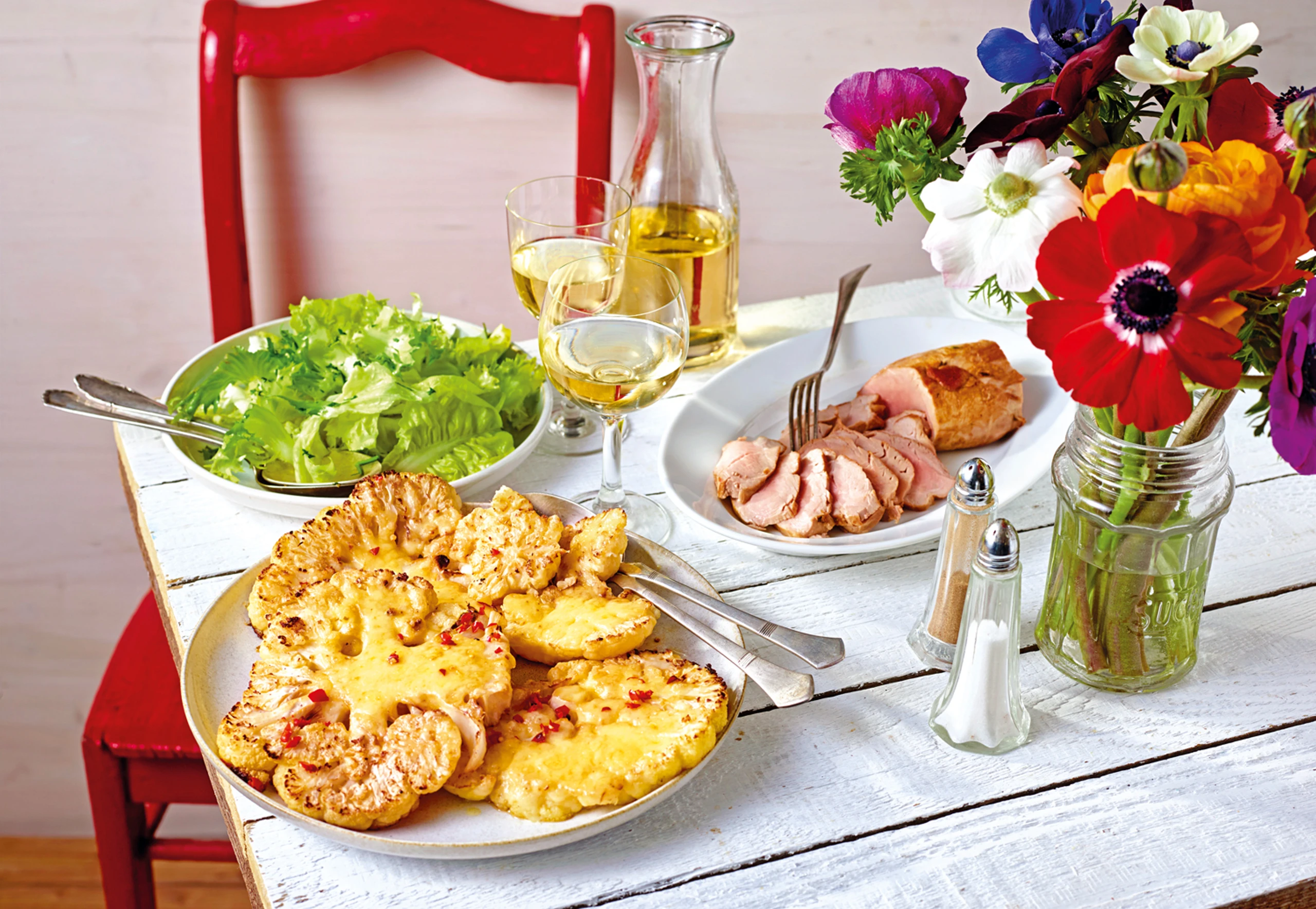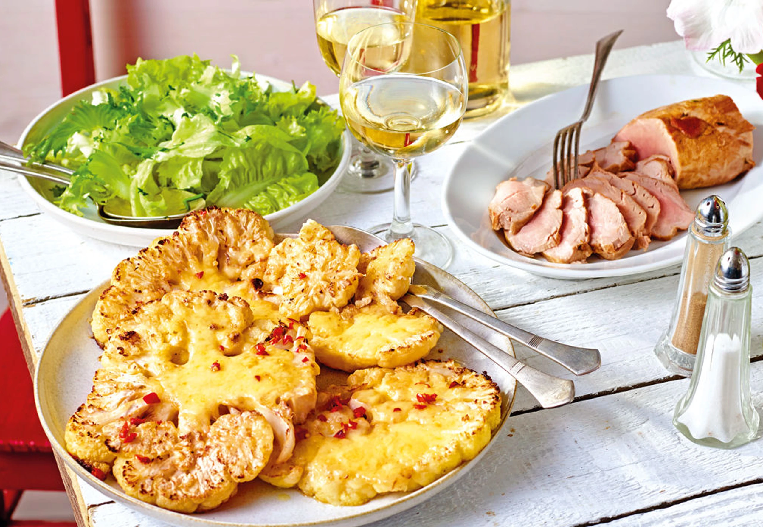 Karfiol mit Käse, Schweinsfilet und Pflücksalat