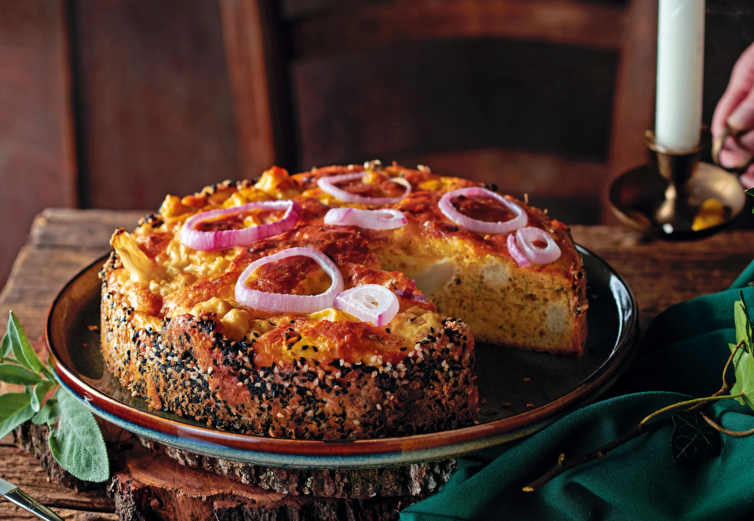 Rote Zwiebel schälen und in Scheiben schneiden. Kuchen mit Zwiebelringen belegen und im Rohr (zweite Schiene von unten / Gitterrost) ca. 45 Minuten goldbraun backen. Herausnehmen und überkühlen lassen. Kuchen aus der Form lösen und servieren.