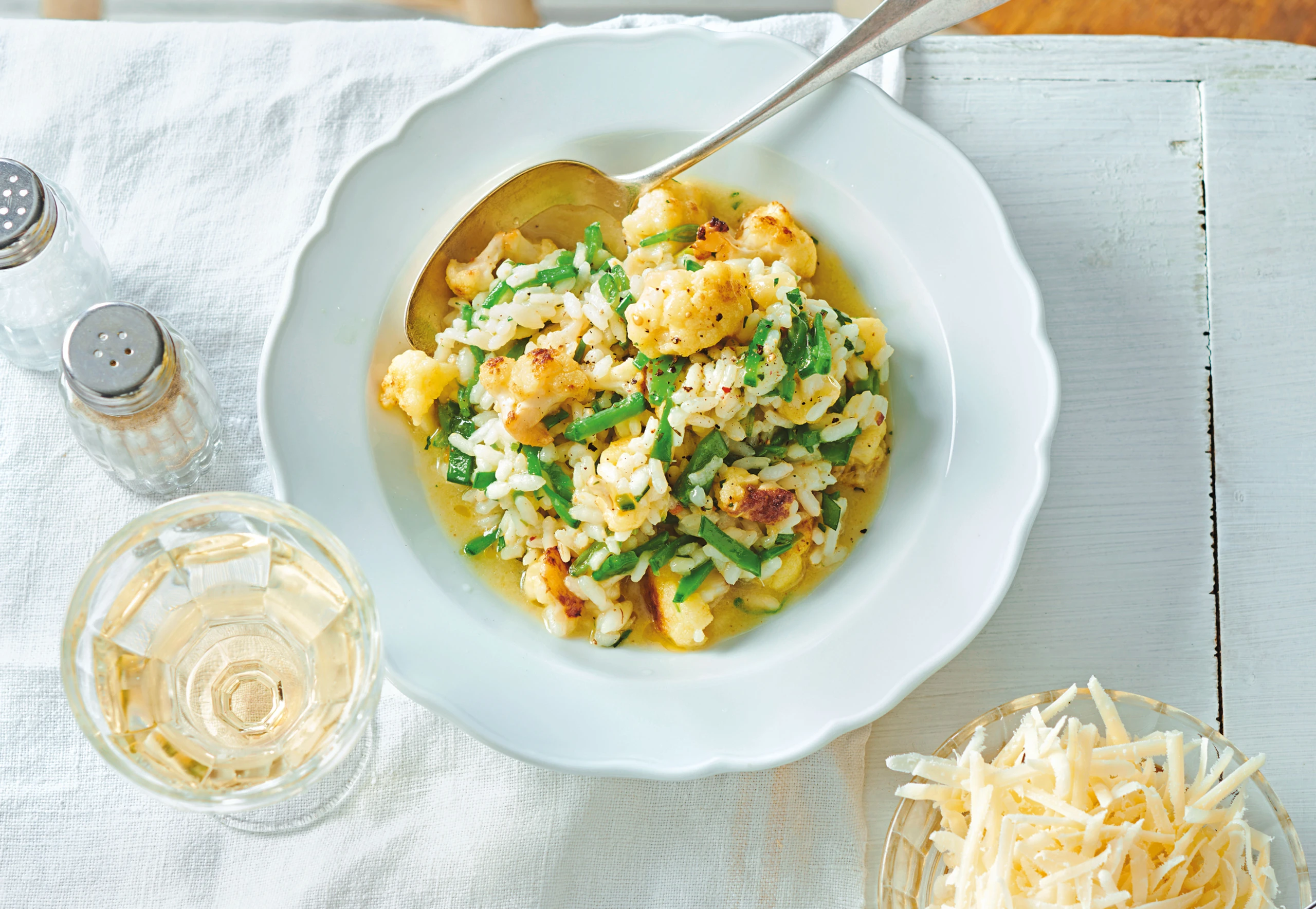 Karfiol-Risotto mit Zuckerschoten und Grana
