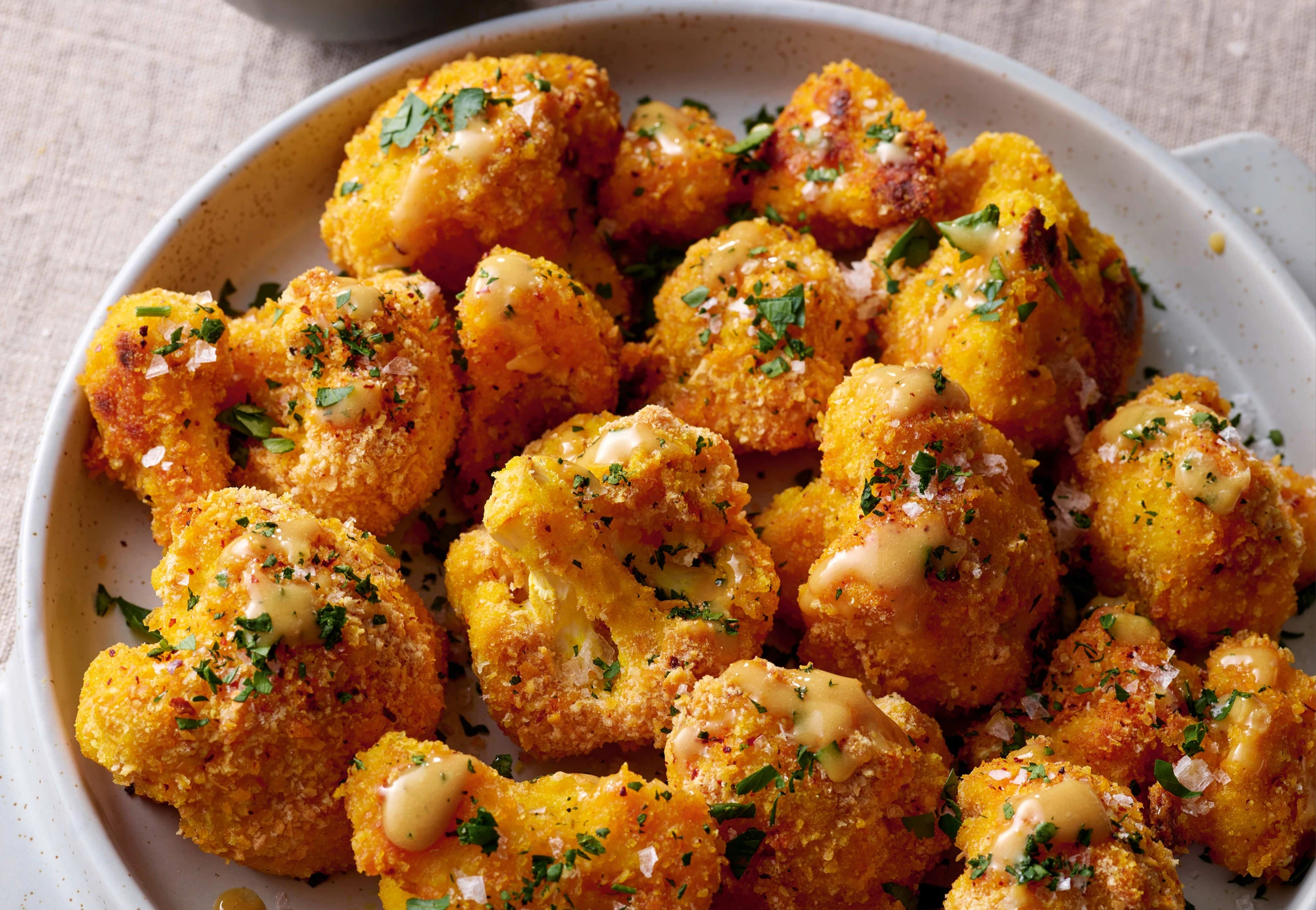 Karfiol-Wings aus dem Rohr nehmen, mit Meersalz, frisch gemahlenem Pfeffer und Petersilie bestreuen und mit Honig-Senf-Dip servieren.